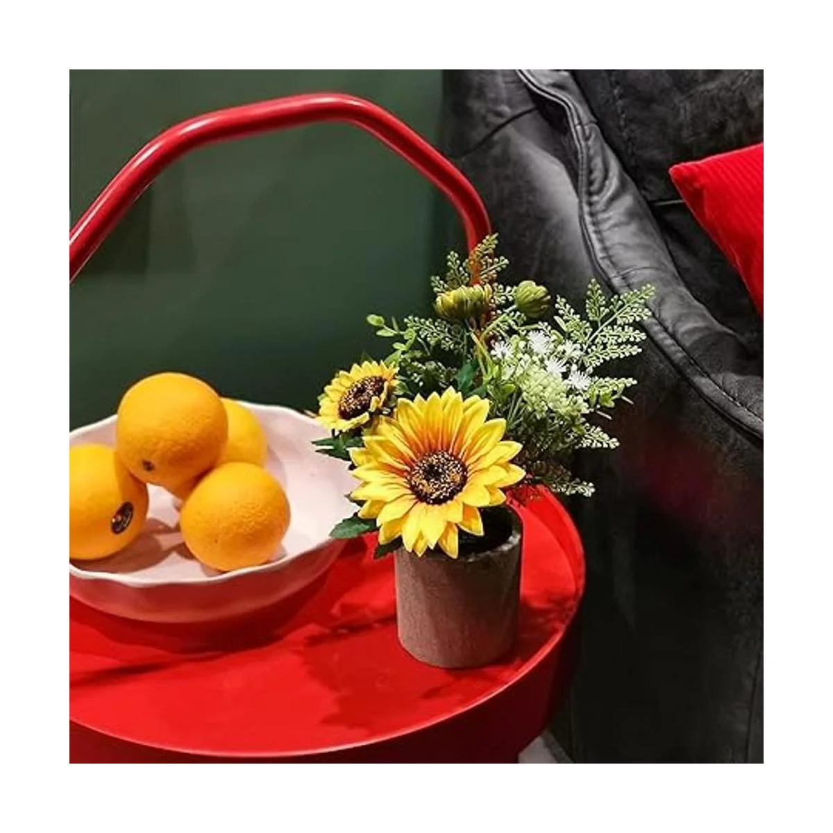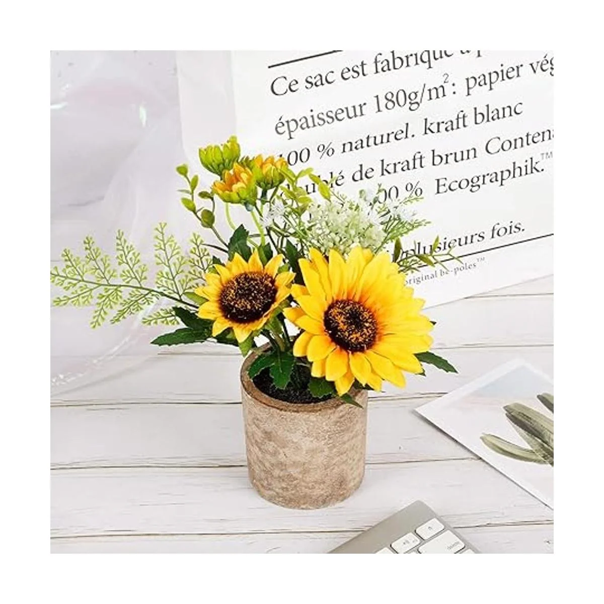 El juego incluye: 1 maceta de girasol de diseño único. Color brillante, con hojas de eucalipto, pequeñas flores blancas y otros elementos, toda la planta es real y natural, y es la decoración perfecta.