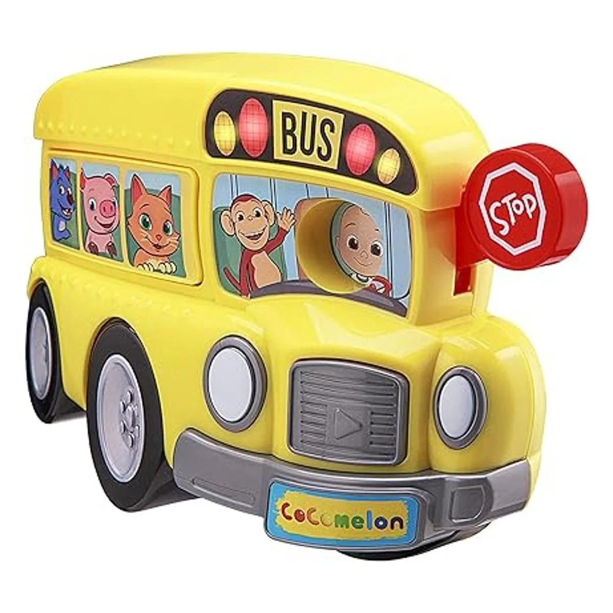 Controles aptos para niños: tira del letrero de parada en el juguete de autobús Cocomelon para cambiar los conductores y canciones con facilidad, todo mientras cantas