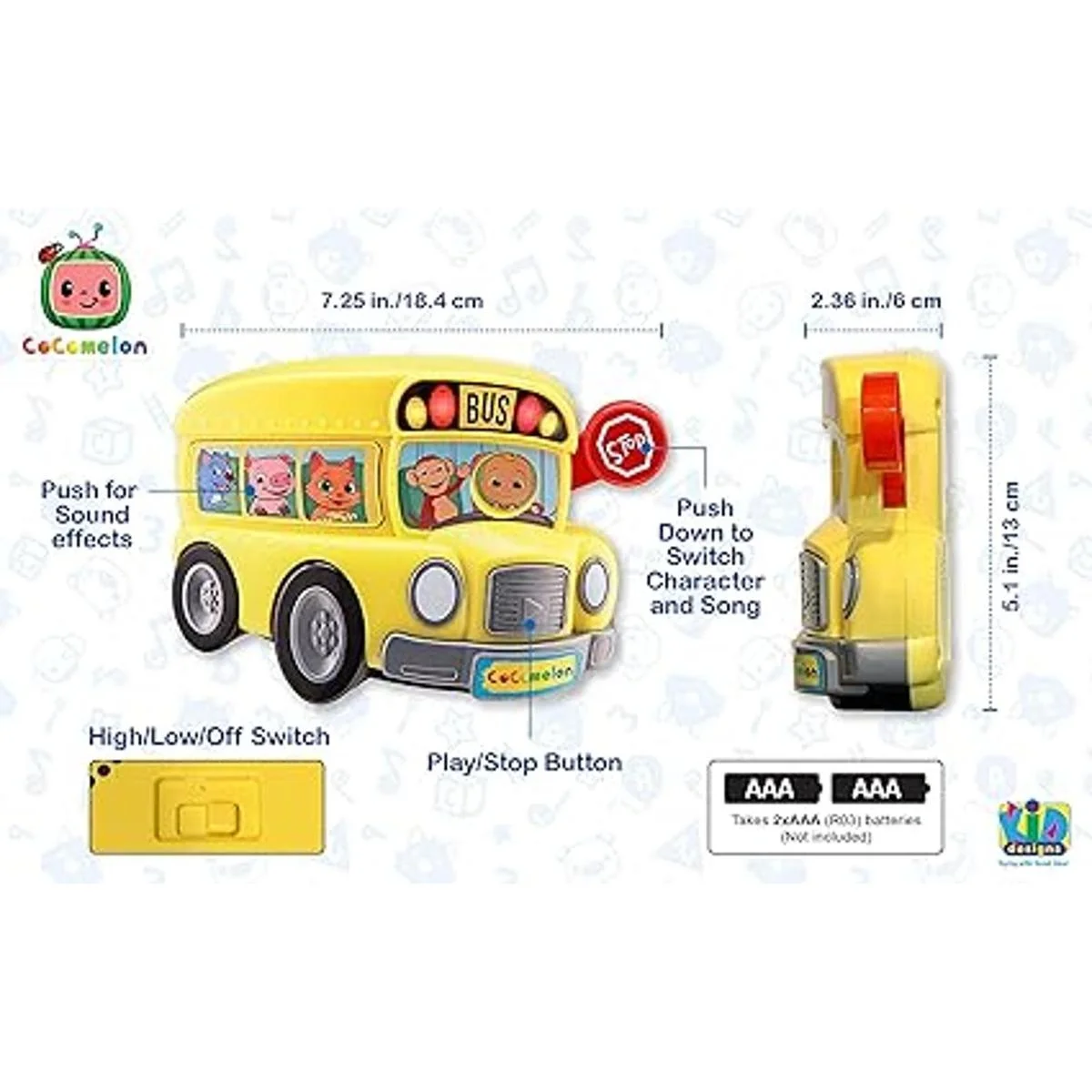 Música integrada: el autobús escolar amarillo musical Cocomelon cuenta con 7 canciones integradas, incluyendo: The Wheels on the Bus y Twinkle, Twinkle Little Star