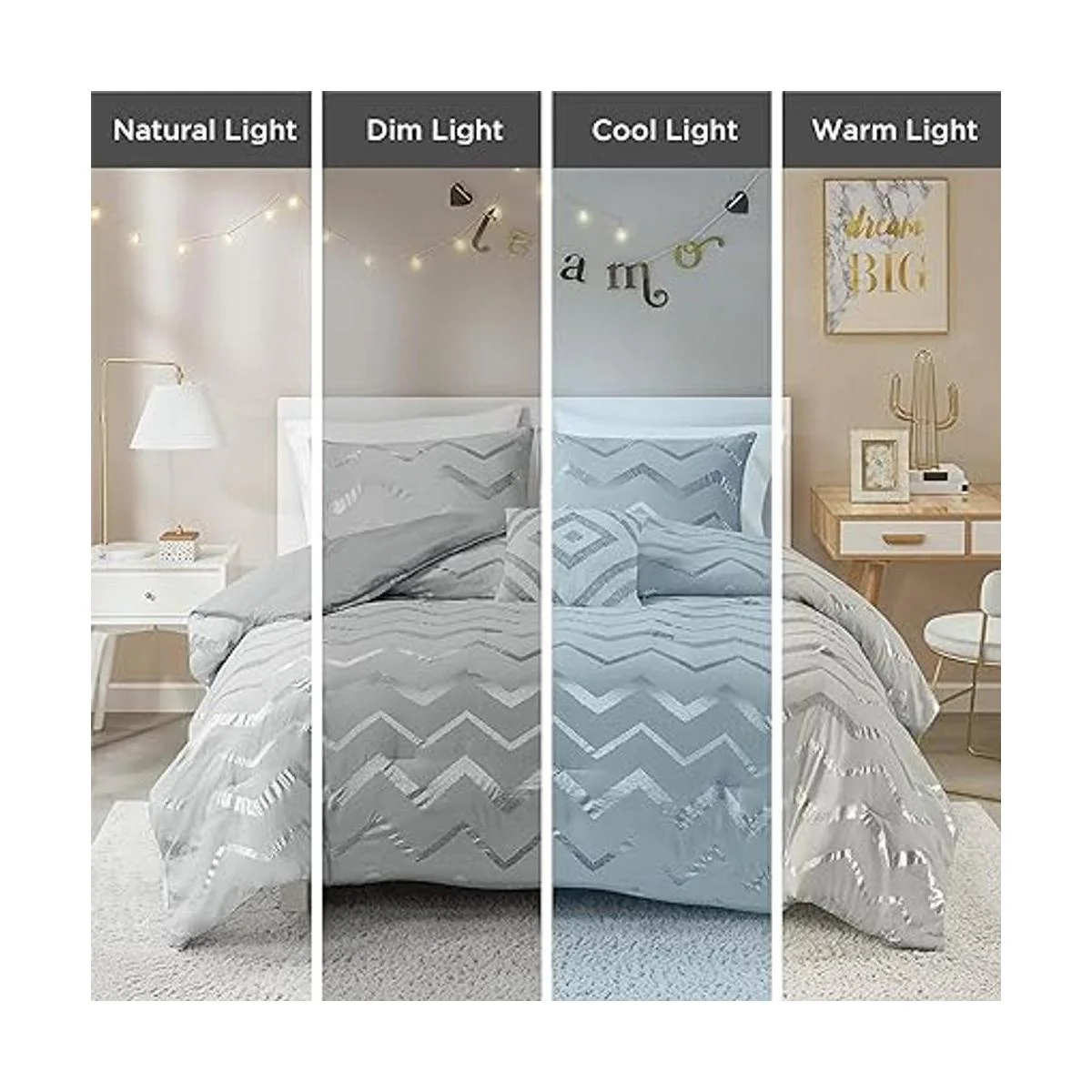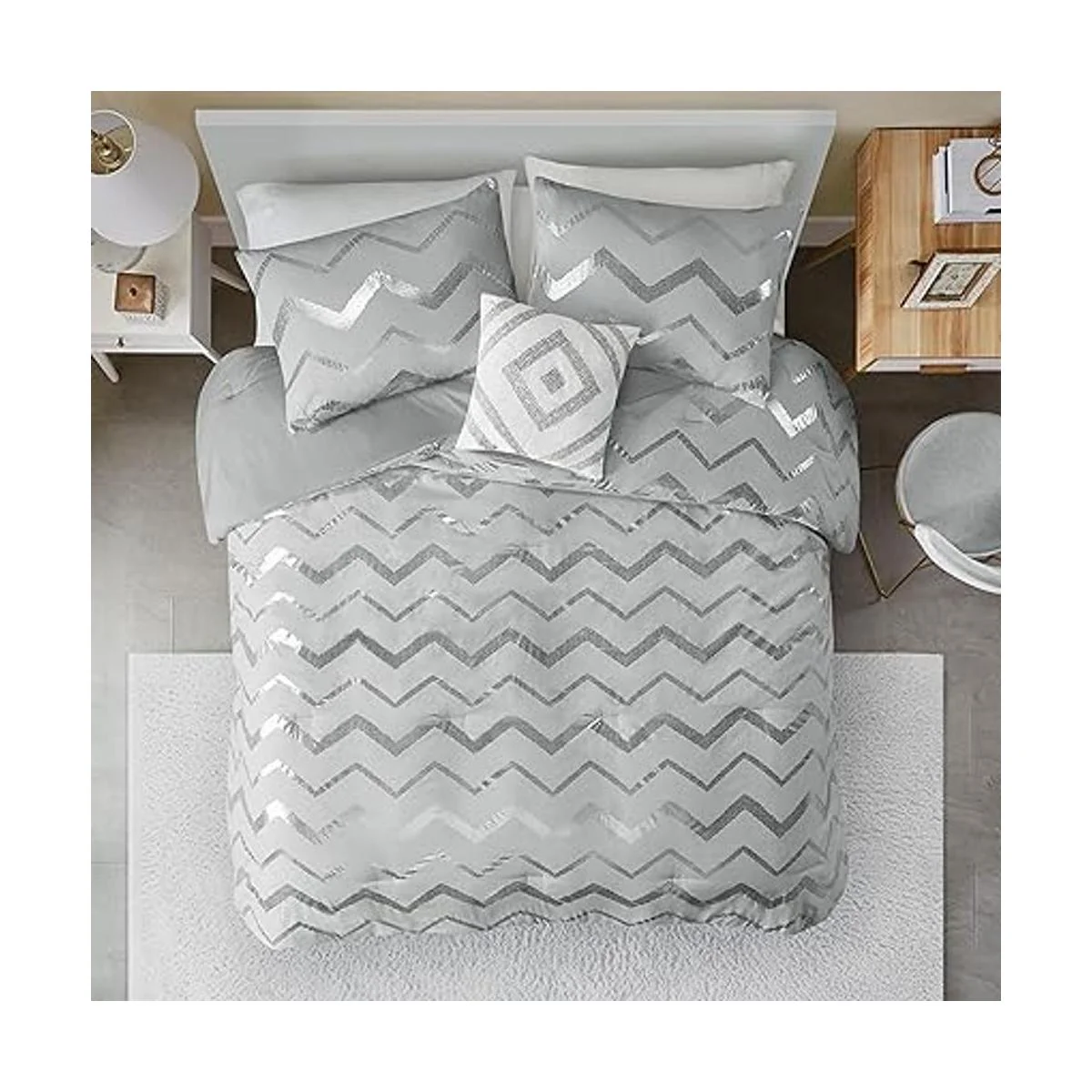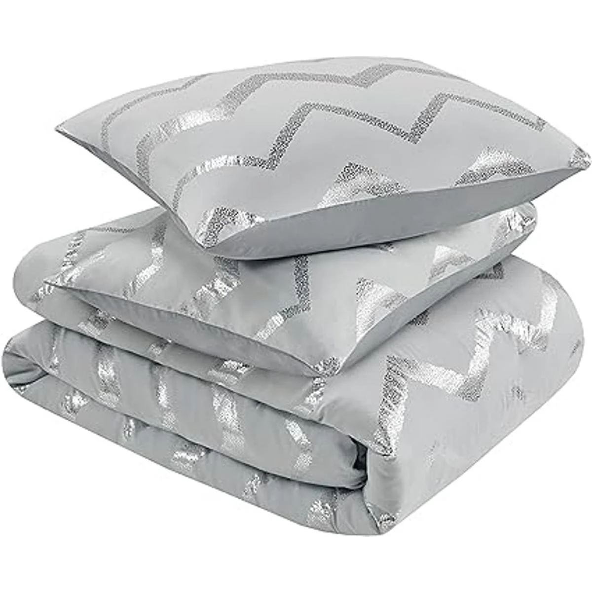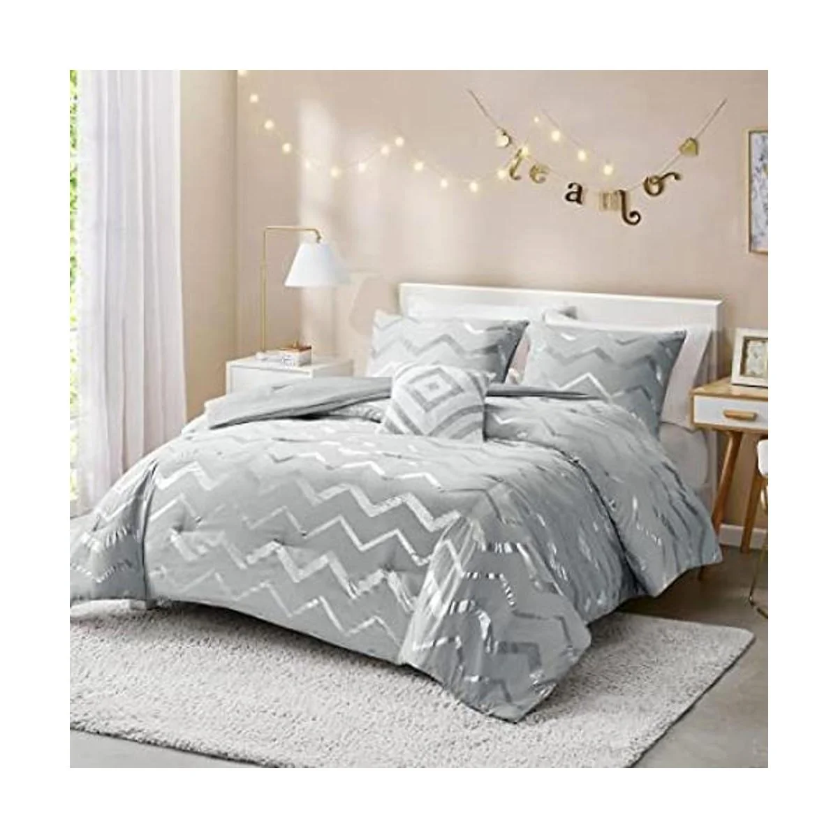 Codi Juego de edredón color gris y plateado con estampado metalizado para cama matrimonialQueen, precioso juego de cama color gris claro, 4 piezas 2 fundas a juego 1 cojín decorativo