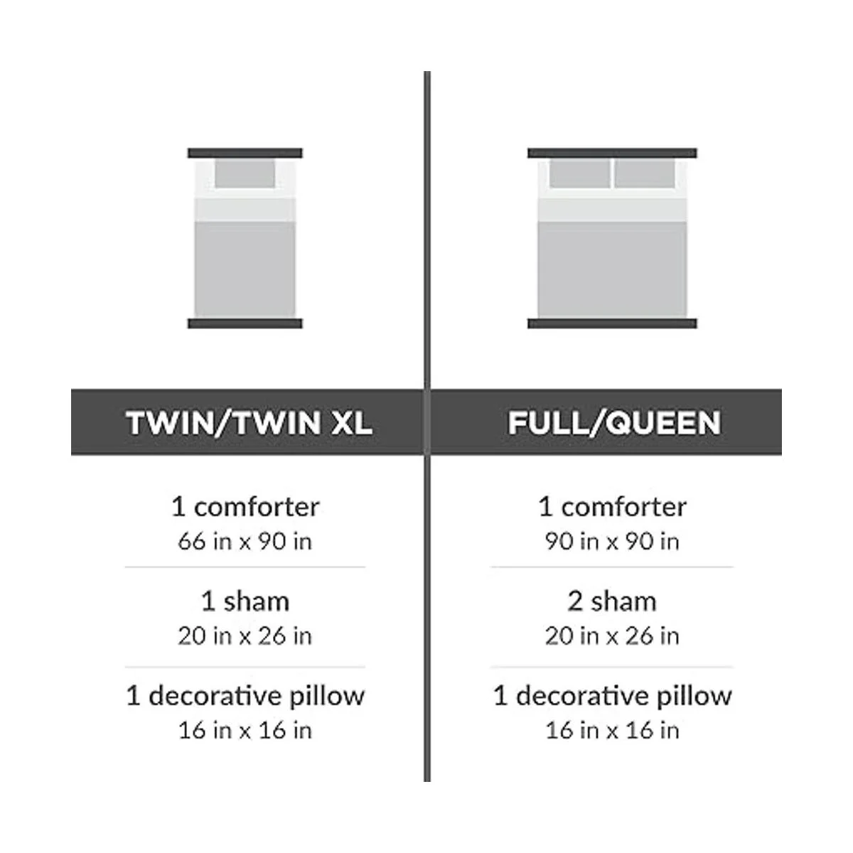 El tamaño matrimonial/Queen incluye: Edredón de 90 pulgadas de ancho x 90 pulgadas de largo, funda de 20 pulgadas de ancho x 26 pulgadas de largo 2 y cojín decorativo de 16 pulgadas de ancho x 16 pulgadas de largo
