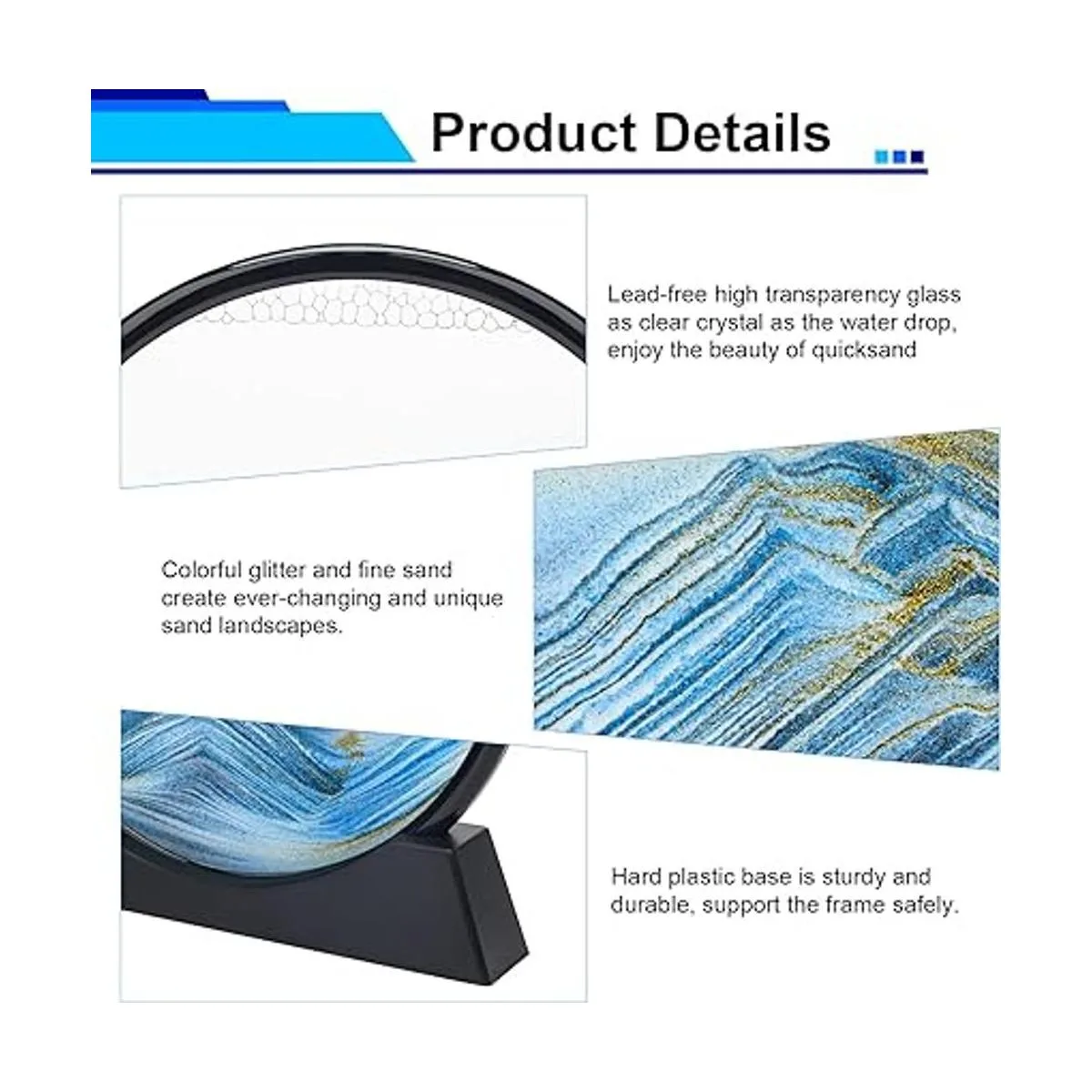 Material de alta calidad: el cuadro de arena está hecho de vidrio de alta transparencia sin plomo, que es tan transparente como la gota de agua, lo que te permite disfrutar plenamente de la belleza de las arenas movedizas. La base de plástico duro es duradera y puede soportar el marco de forma segura.