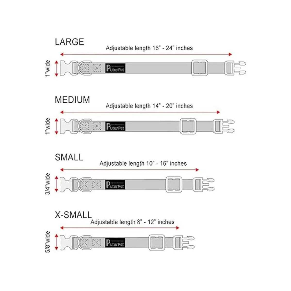 Adecuado para todas las latas: ajuste la correa para asegurarse de que su perro tiene su propio cuello de circunferencia: XS8 a 12 ancho 5/8, S10 a 16 ancho 3/4, M14 a 20 ancho 1, L16 a 24 ancho 1