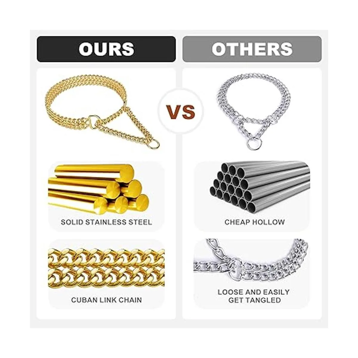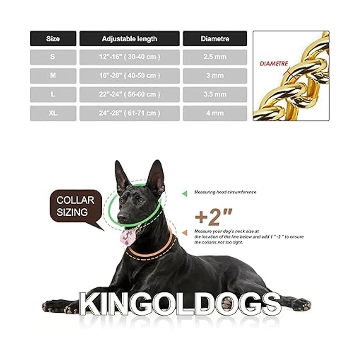 Material del collar de oro para perro: el collar de estrangulamiento Kingoldogs para perros está chapado en acero inoxidable 316L con oro de 18 quilates, y el chapado en oro es 30 veces más grueso que otras cadenas chapadas en oro, años de uso sin decoloración. Los collares son muy resistentes, duraderos, no se oxidan ni se deslustran. La artesanía de alto pulido hace que la superficie sea brillante y lisa, cómoda. Así que creemos que tu peludo amigo estará feliz de poseer este collar de estrangulamiento para perros.