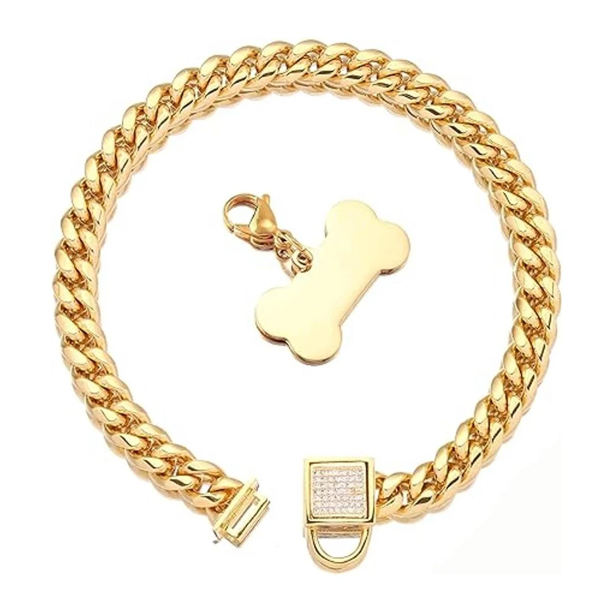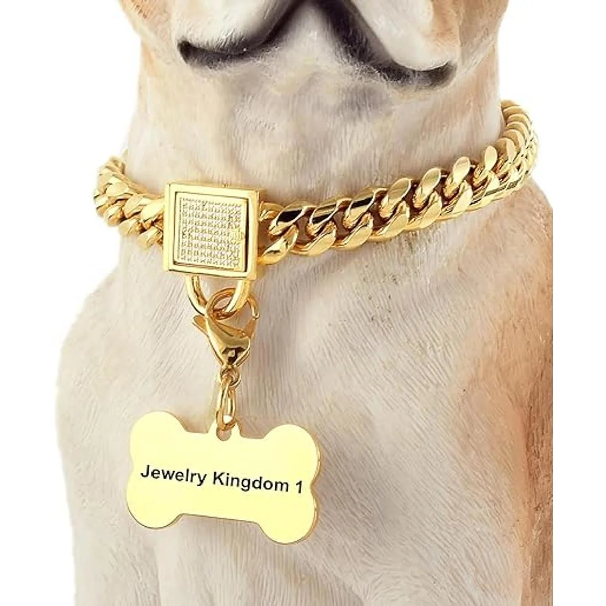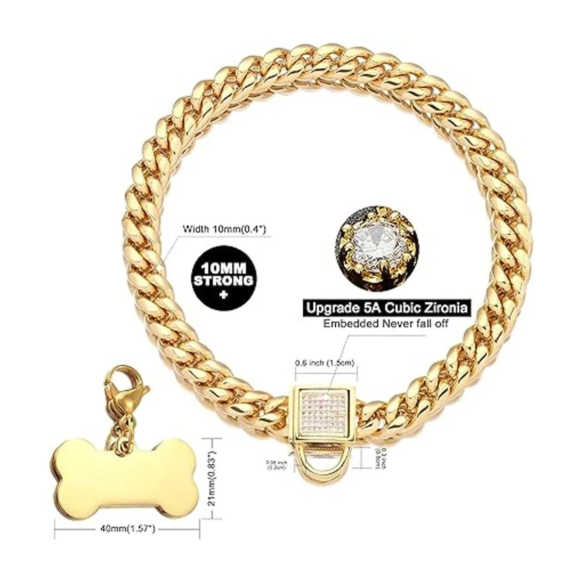 Collar de cadena para perro dorado con hebilla segura con piedras de circonita cúbica heladas y etiqueta para perro, acero inoxidable de 18 quilates, cadena de eslabones cubanos de acero inoxidable para caminar 0.394 in, 20 pulgadas