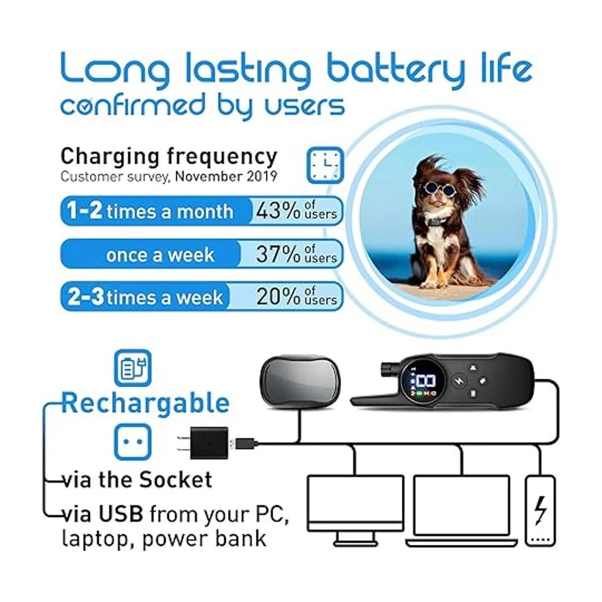 Solo necesitas cargar una vez por semana: la batería de iones de litio de larga duración significa que con el uso normal, solo necesitas cargar el collar una vez a la semana. Además, el control remoto cabe fácilmente en tu bolsillo para que puedas llevarlo contigo. Viene con modo de espera de ahorro de batería