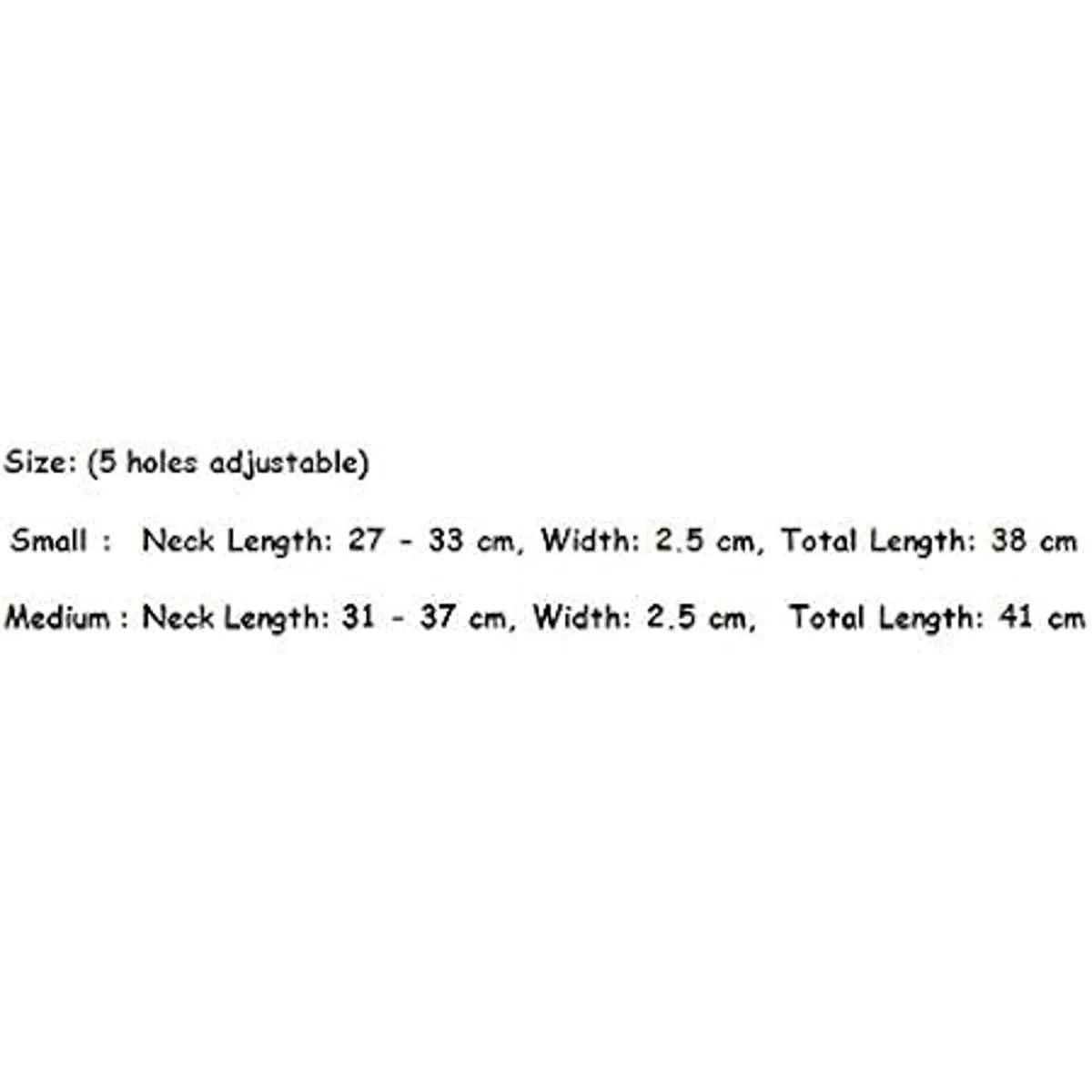 Tamaño: 5 agujeros ajustables. Longitud del cuello pequeño: 26,6 a 13.0 in. Ancho: 1.0 in. Longitud total: 14.5 in. Longitud del cuello mediano: 30,4 a 14.5 in. Ancho: 1.0 in. Longitud total: 16.0 in