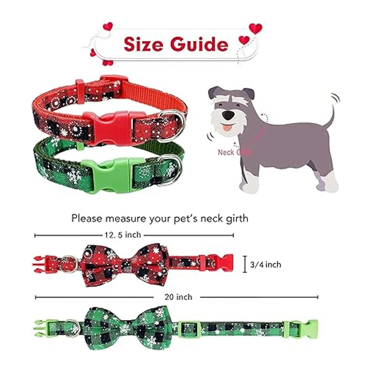 Tamaño ajustable: paquete de 2; 12.520 pulgadas, ancho 3/4 pulgadas; tamaño del corbatín: 3.54 x 1.96 pulgadas ancho x alto. Mide el cuello de tu mascota para obtener el tamaño correcto.