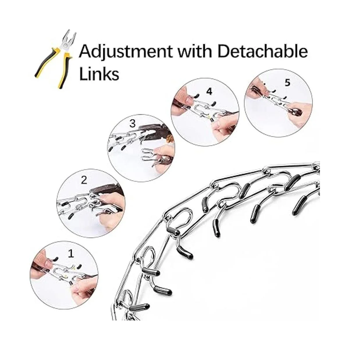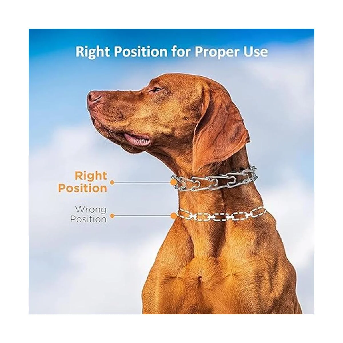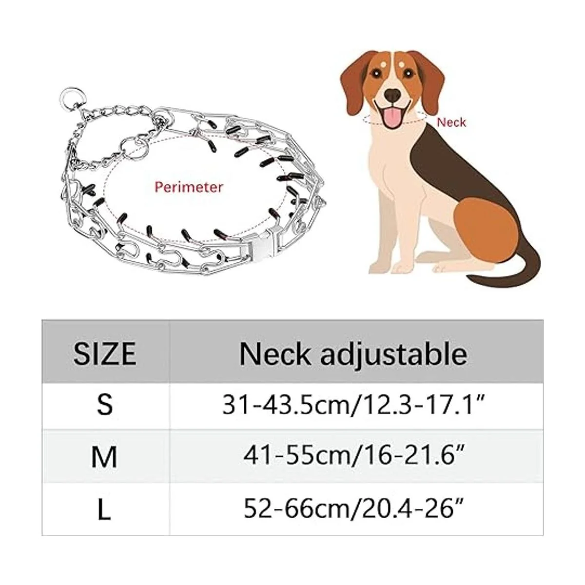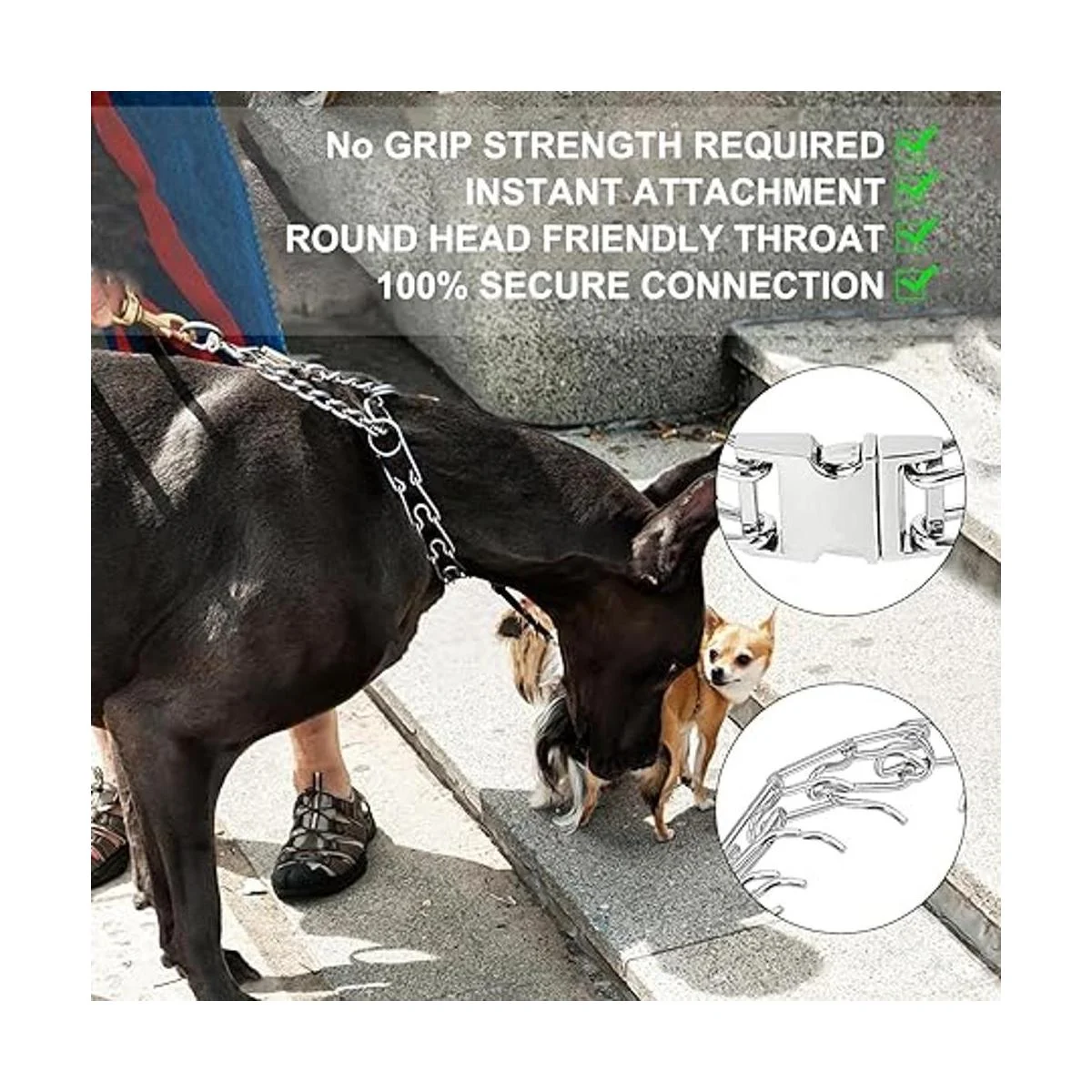 Bucle de fácil amigo Este exclusivo collar de perro tiene una hebilla de liberación rápida diseñada a medida que es amigable con tu perro y hace que quitar la correa de tu perro sea muy fácil. 8 eslabones colocados directamente alrededor del collar para garantizar que llamarás la atención de tu perro sin importar el ángulo.