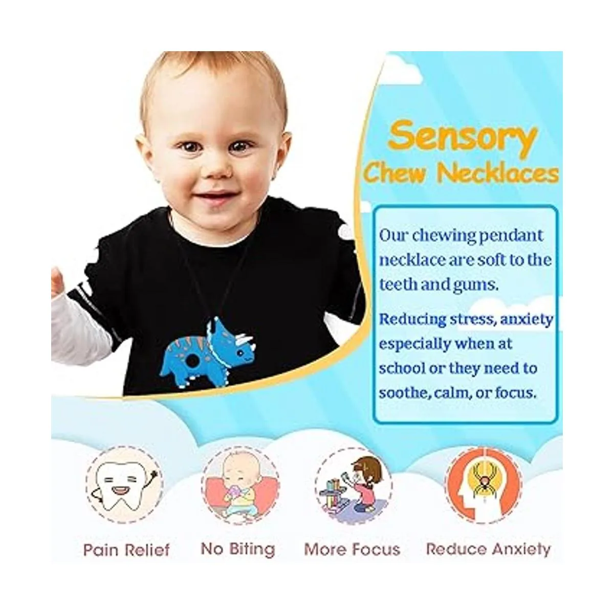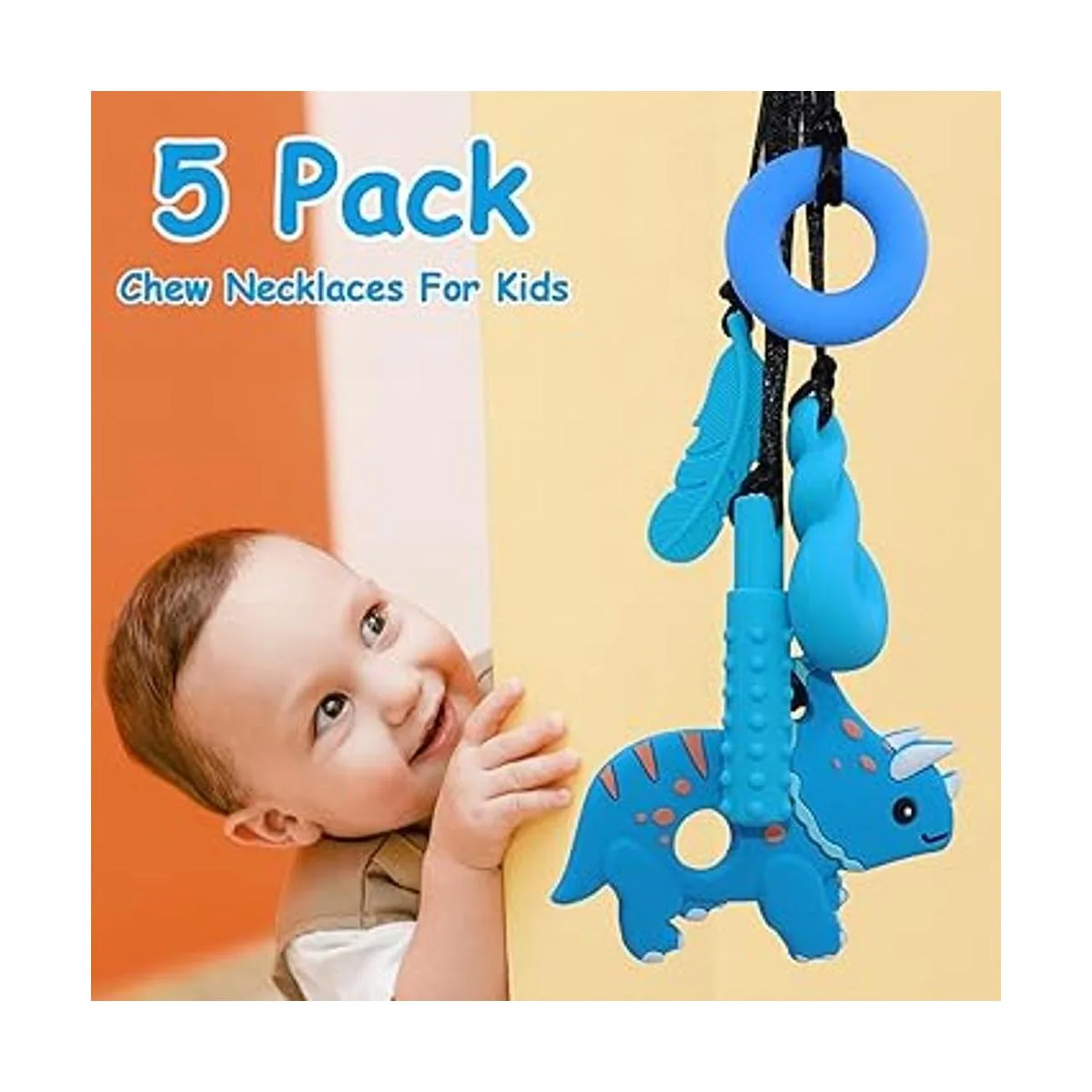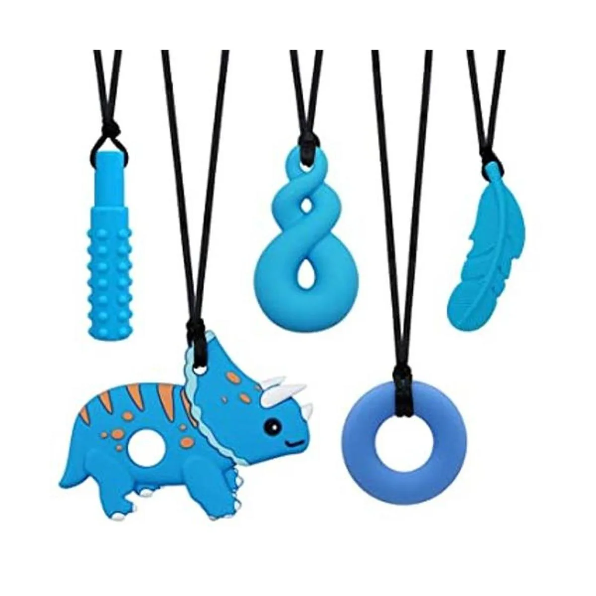 Diseño y tamaño: el colgante masticable de dinosaurio con superficies texturizadas puede calmar y estimular las encías de los niños. Masticables de tamaño correcto, los cordones son fáciles de acortar, simplemente empuja el cordón a través del cierre de separación y vuelve a atar el nudo a la longitud deseada.