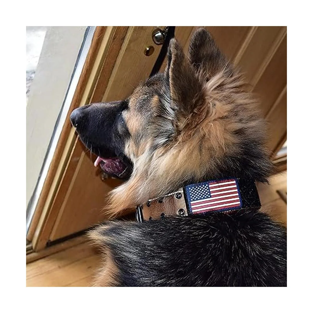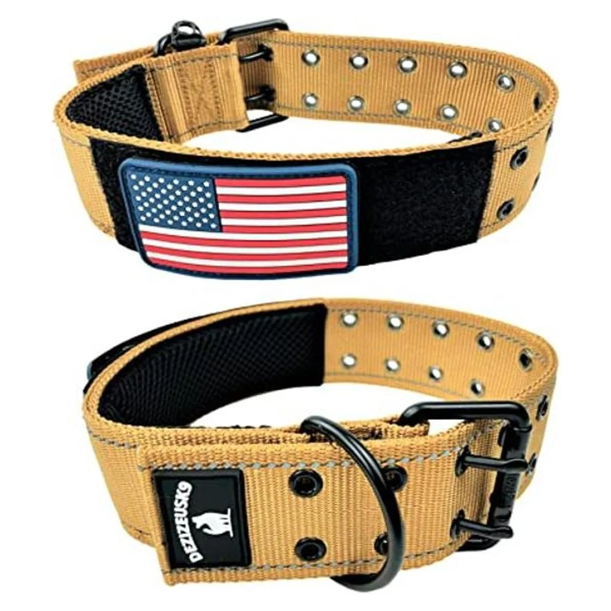 Collar para perro K9 estilo militar táctico 2.0 in de ancho, correa de nailon grueso resistente para perros grandes grandes y fuertes, hebilla de cinturón de metal de dos pines, parche de bandera estadounidense 2028 pulgadas, color bronceado