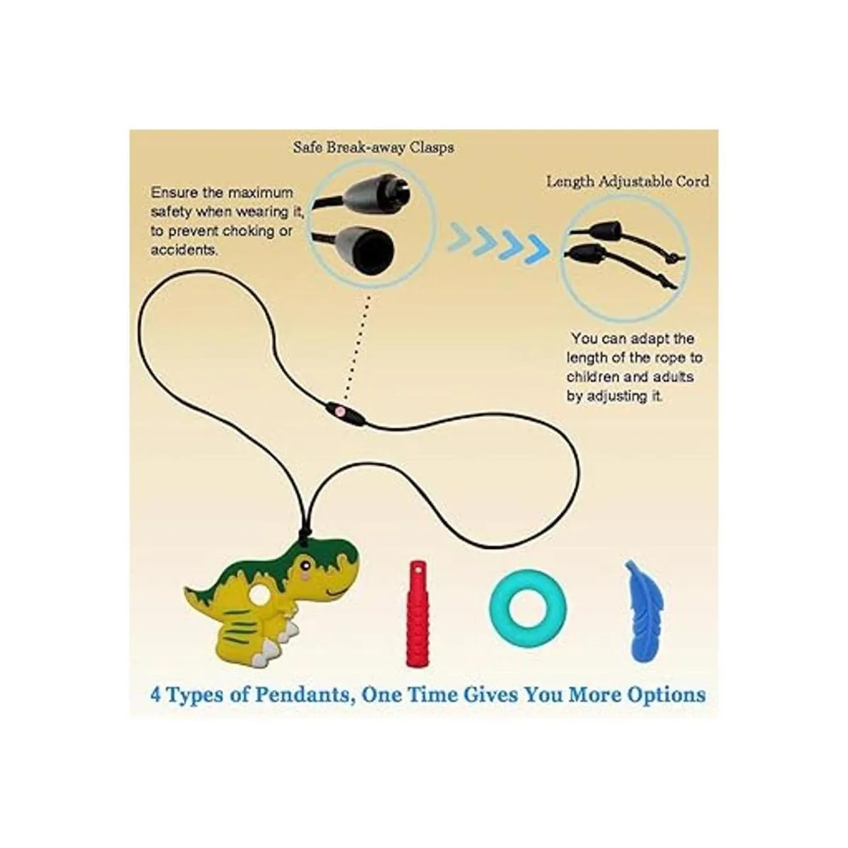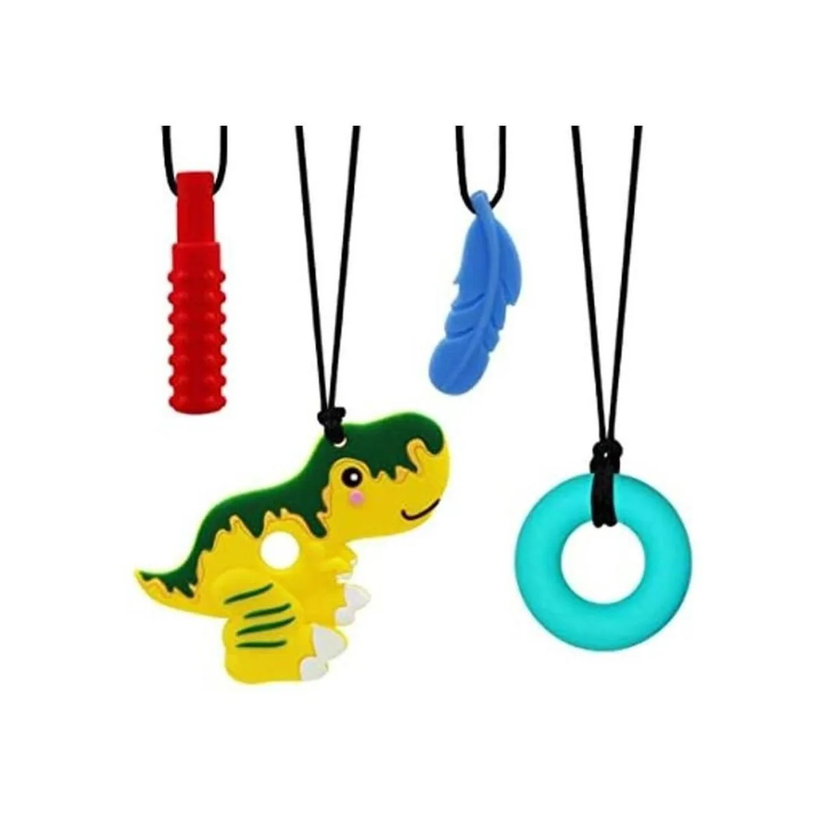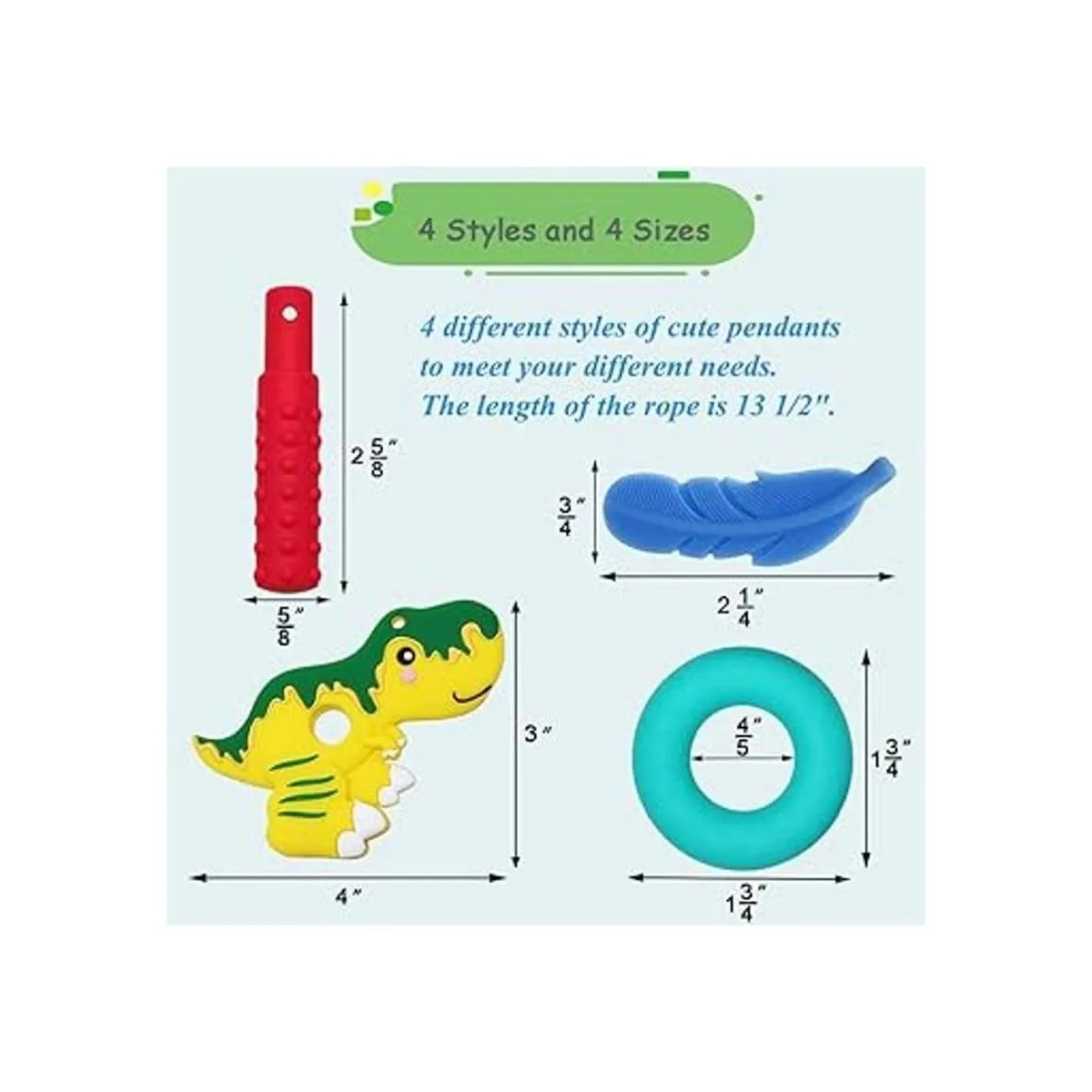 Paquete de 4 collares masticables: nuestro juego de collar sensorial para masticar incluye 4 artículos populares: 1 dinosaurio, 1 dona, 1 pluma, 1 palo. Este collar de silicona para masticar tiene una superficie especialmente texturizada para ayudar a los niños y niñas sensoriales a reducir la ansiedad.