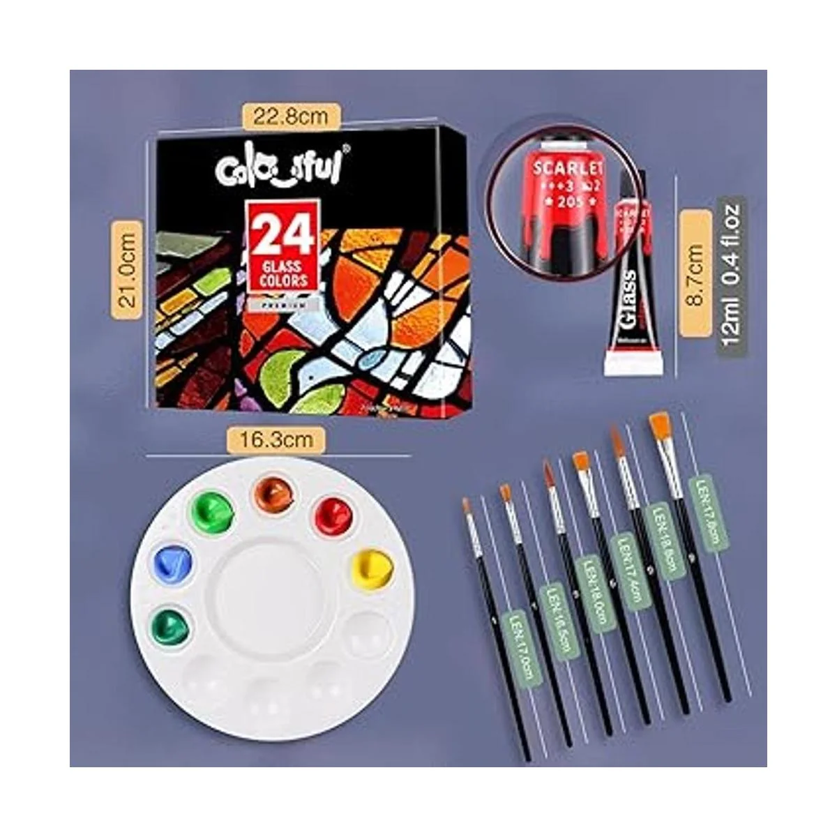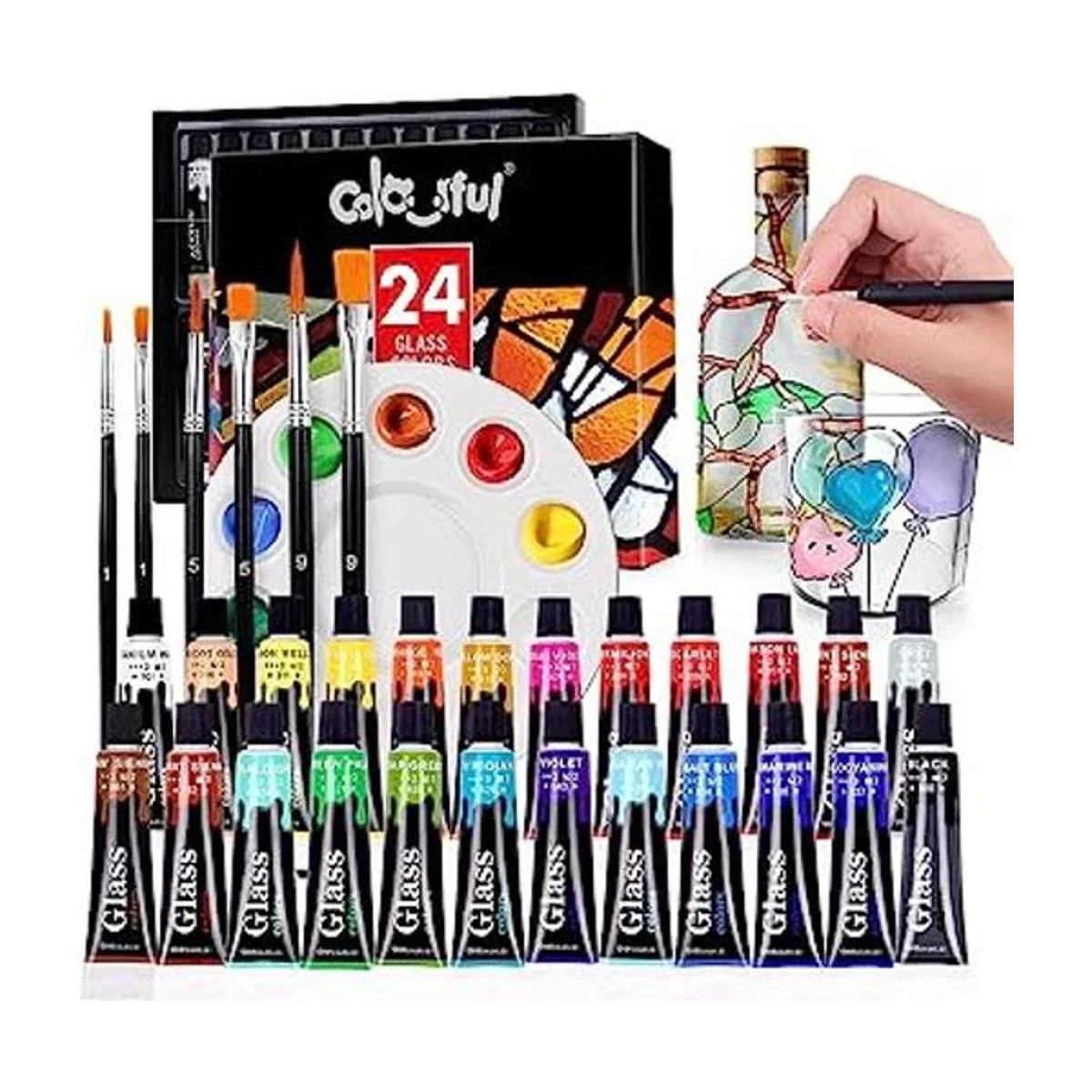 Colorful Juego de pintura de vidrio para manchas con 6 pinceles, 1 paleta, 24 colores impermeables, kit de pintura de esmalte acrílico para niños para artes en copas de vino transparentes, bombillas, porcelana, ventanas y cerámica