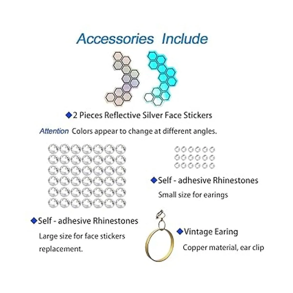 El paquete incluye: 1 peluca 2 calcomanías para la cara diamantes de imitación 1 pendiente 1 gorra de peluca