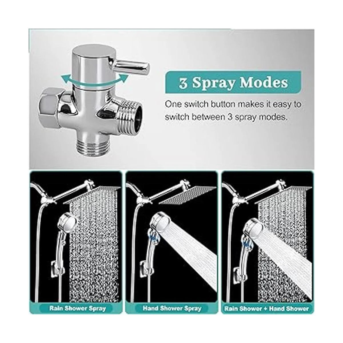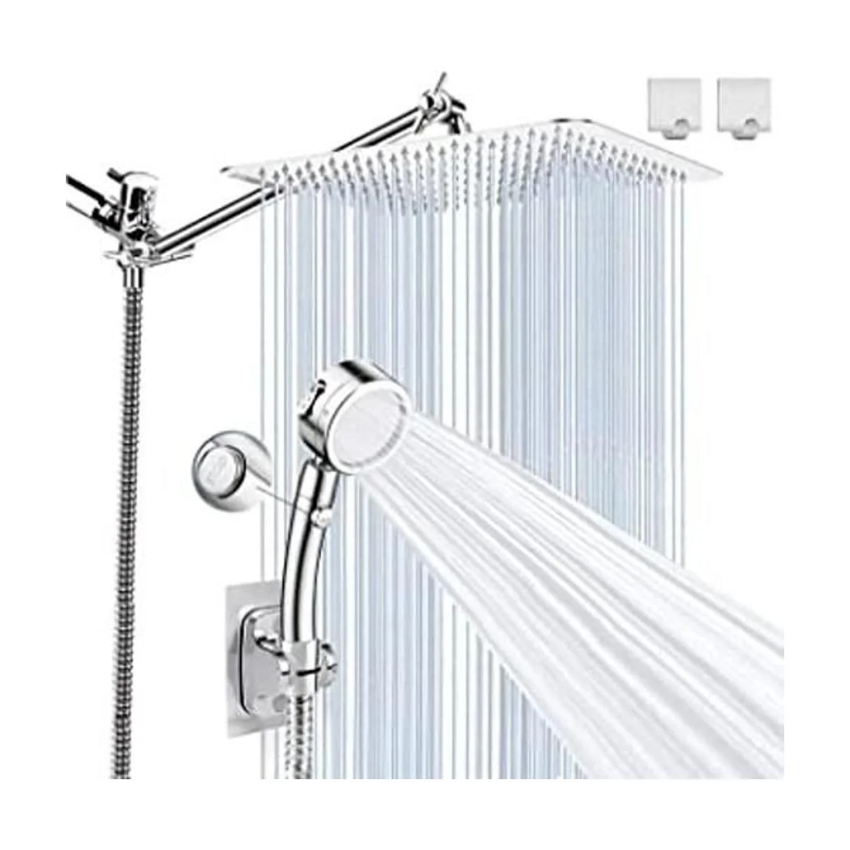 Combinación de cabezal de ducha: incluye cabezal de ducha cuadrado de 10 pulgadas, superficie cromada de 3.3 pulgadas y 3 ajustes de pulverización, manguera de acero inoxidable de 87 pulgadas, desviador de tres vías, soporte de ducha adhesivo, cinta de teflón, junta, manual de instalación idioma español no garantizado.