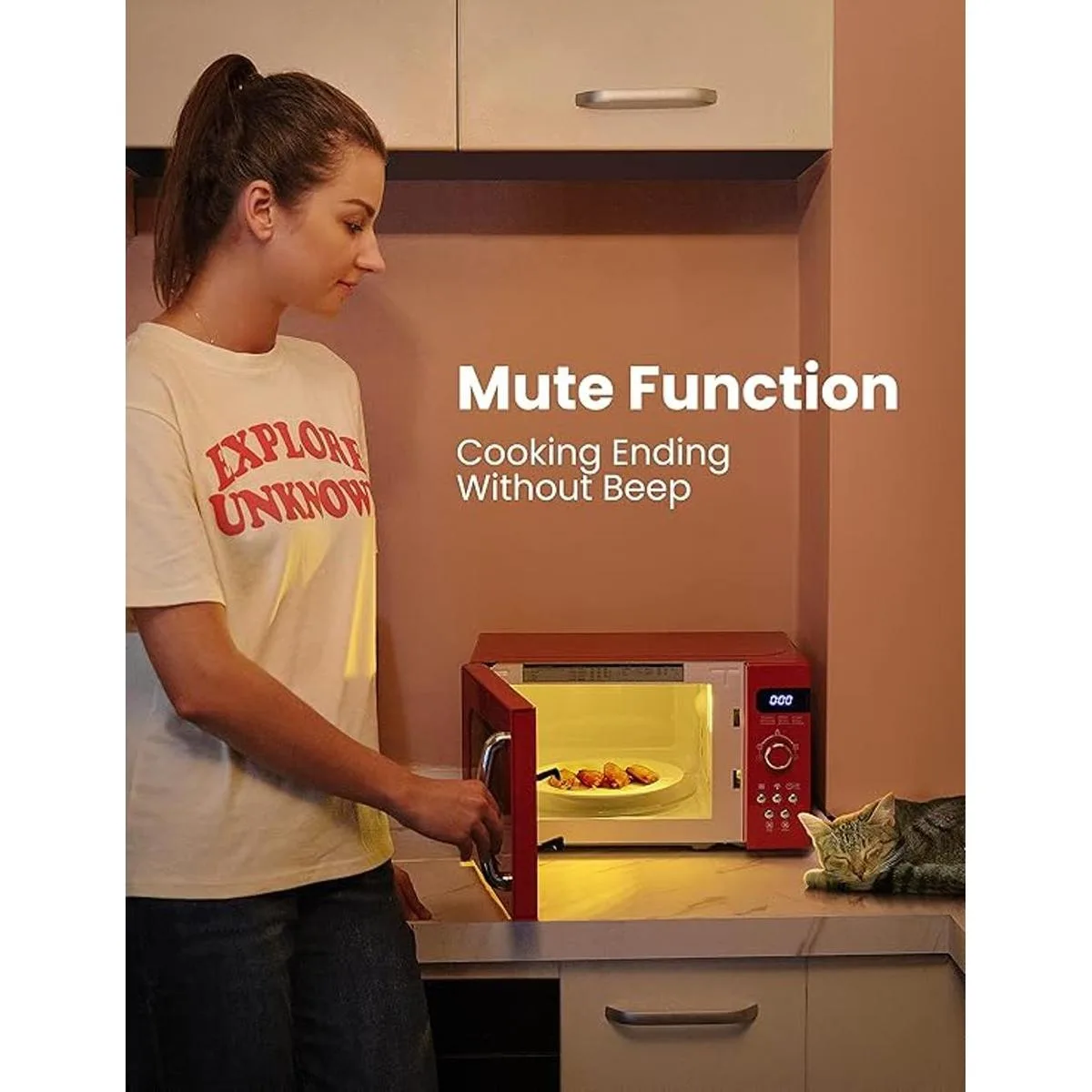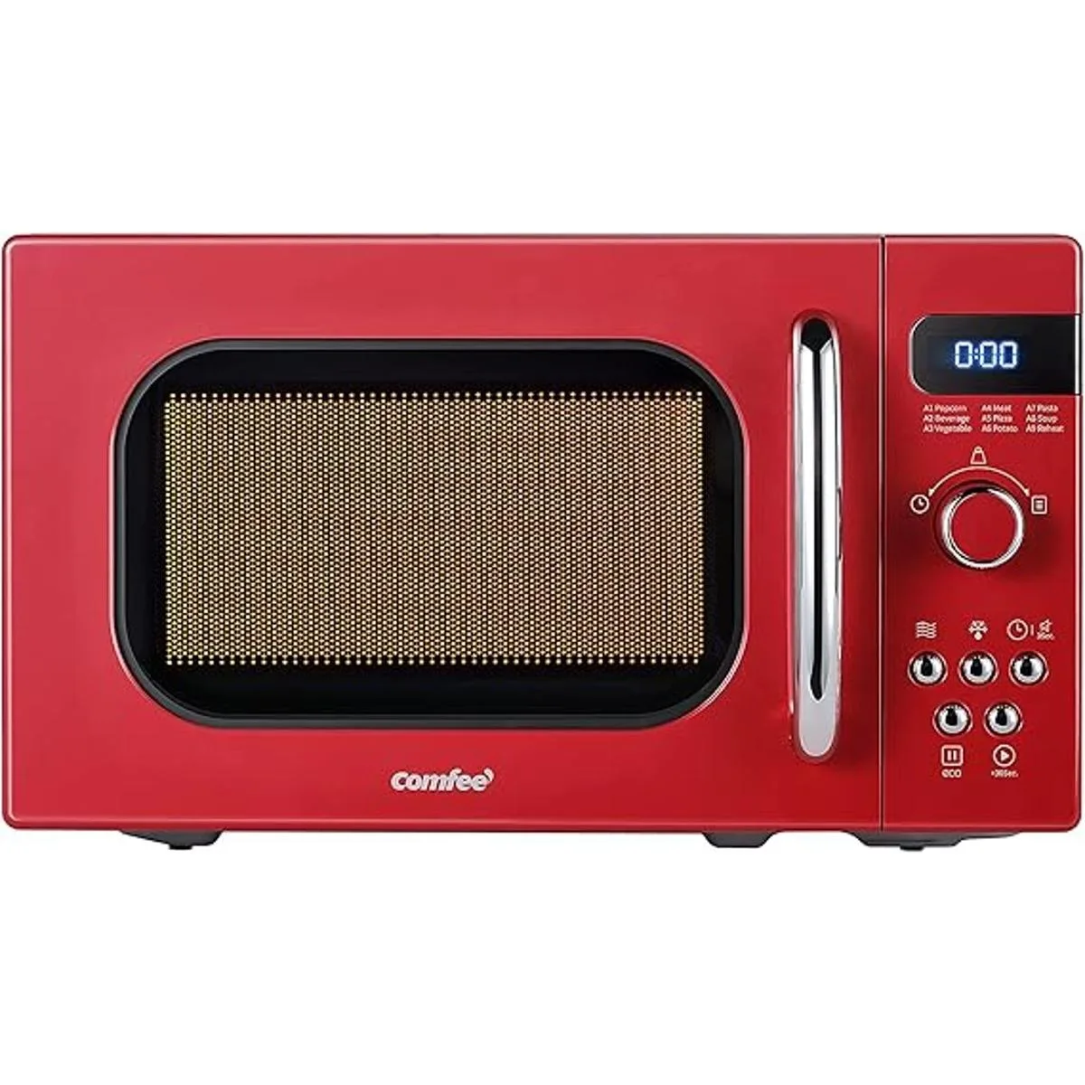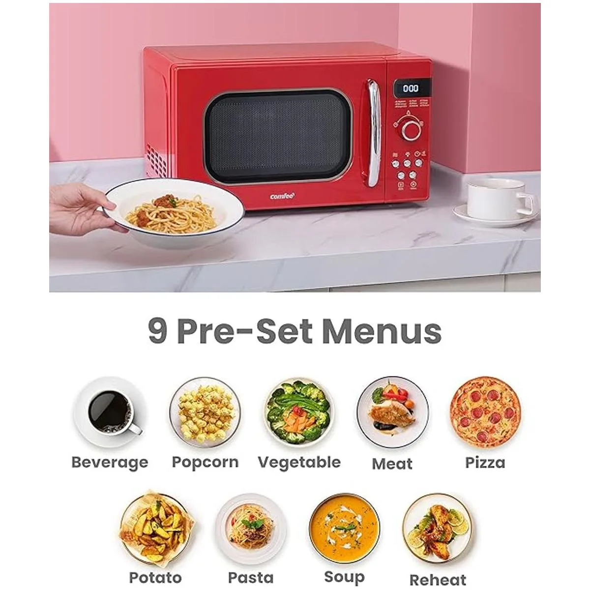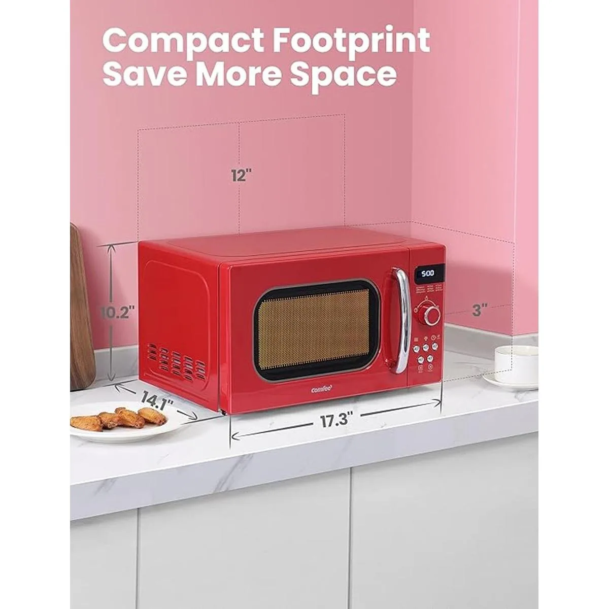COMFEE Horno microondas retro de tamaño compacto para encimera, base giratoria con memoria de posición, botón de encendido y apagado de sonido