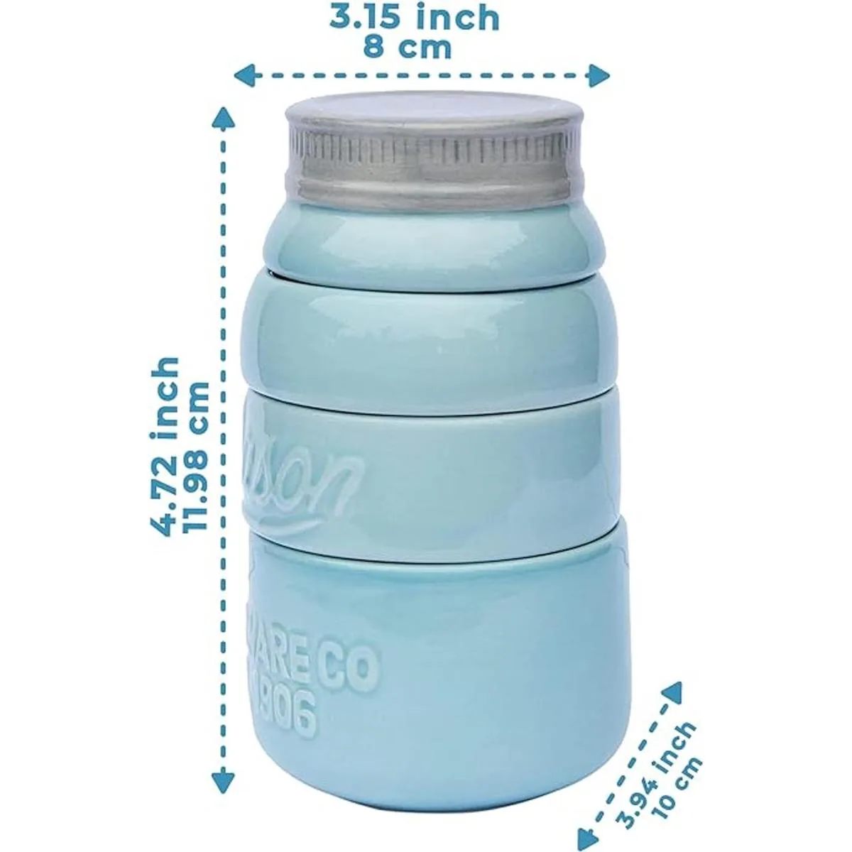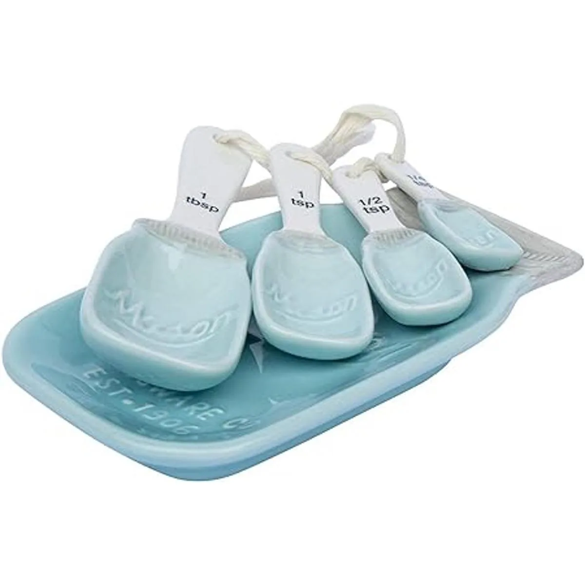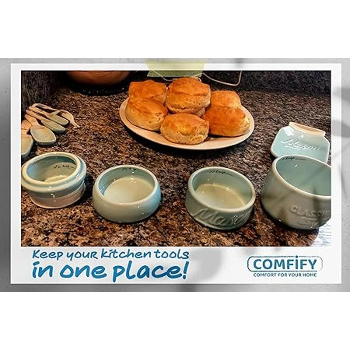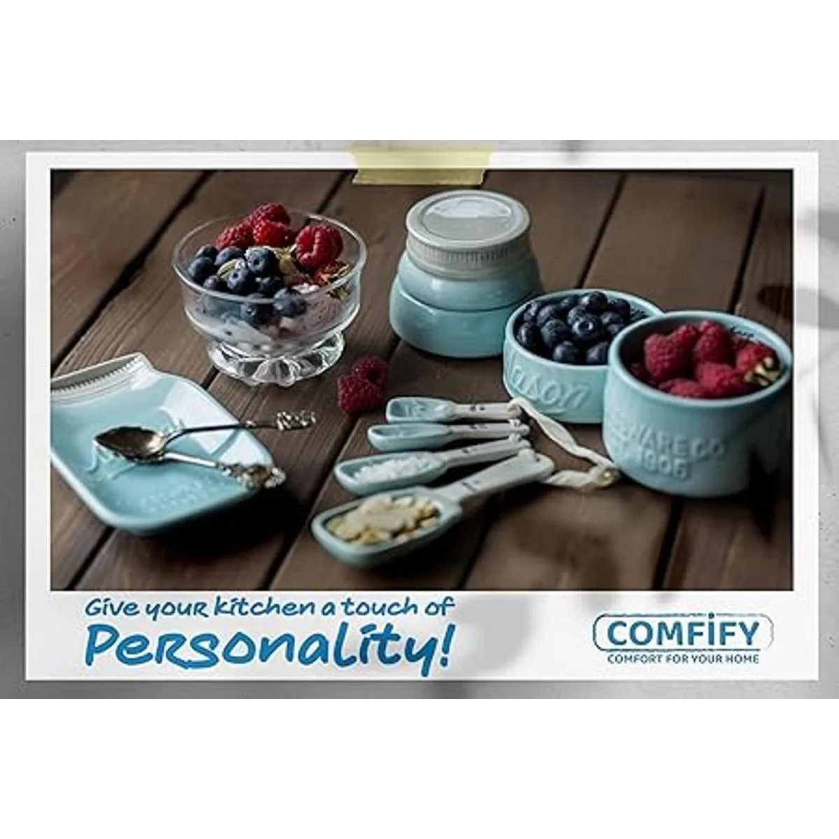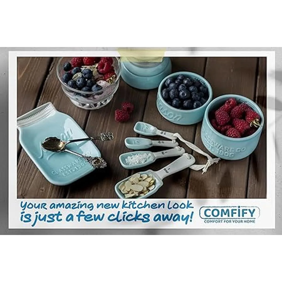 Comfify Juego de utensilios de cocina vintage en tarro Mason Juego de decoración de cerámica de cocina de varias piezas con 4 tazas medidoras, 4 cucharas medidoras y soporte para cucharas Atractivo estilo vintage, en cerámica en relieve azul aguamarina