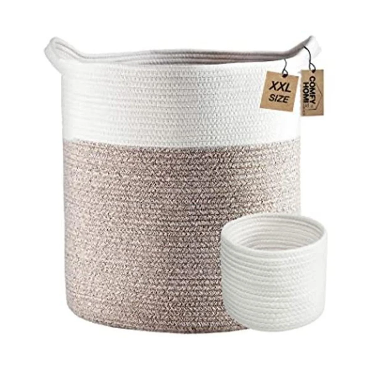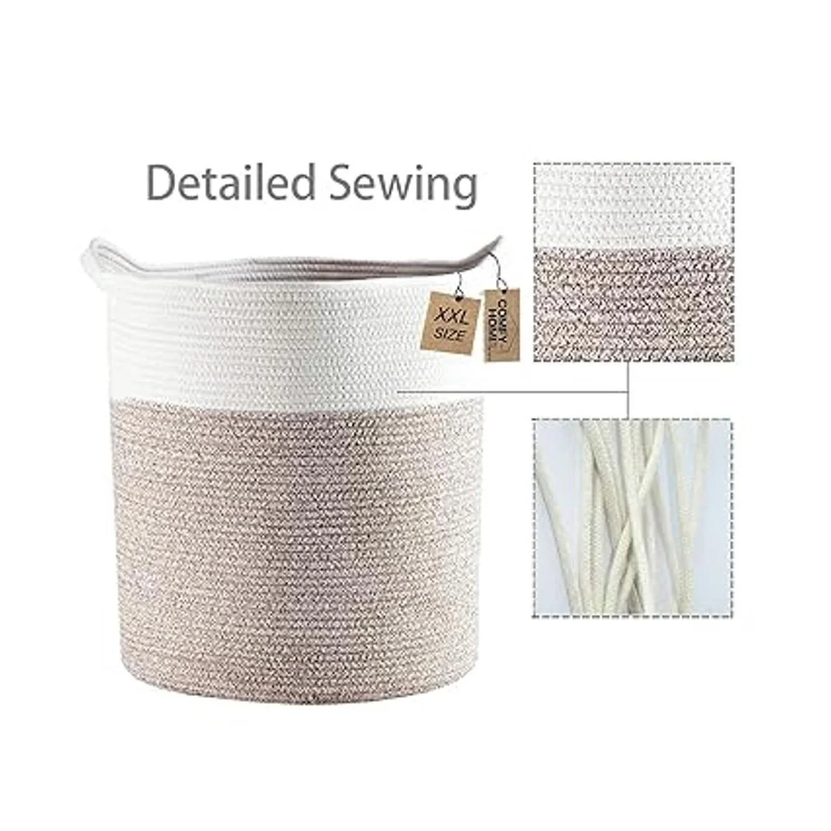 COMFYHOMI Canasta grande de 18 x 16 pulgadas de alto, canasta decorativa de cuerda de algodón tejida con asas, cesta decorativa para mantas, cesta redonda de almacenamiento para sala de estar, ropa, almohadas, toallas blanco marrón