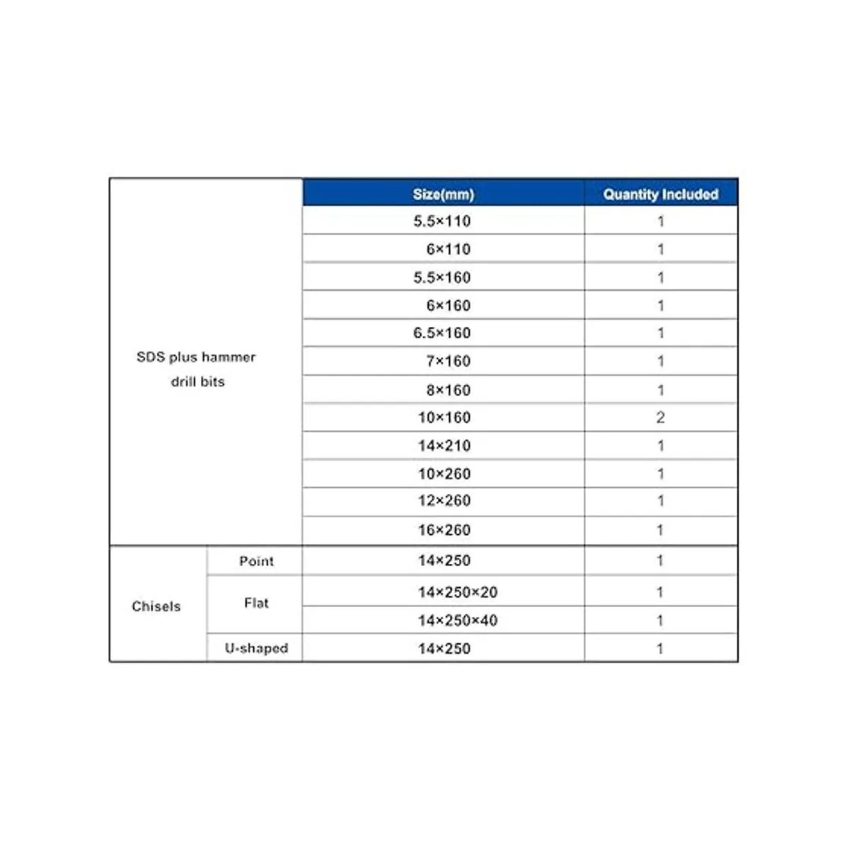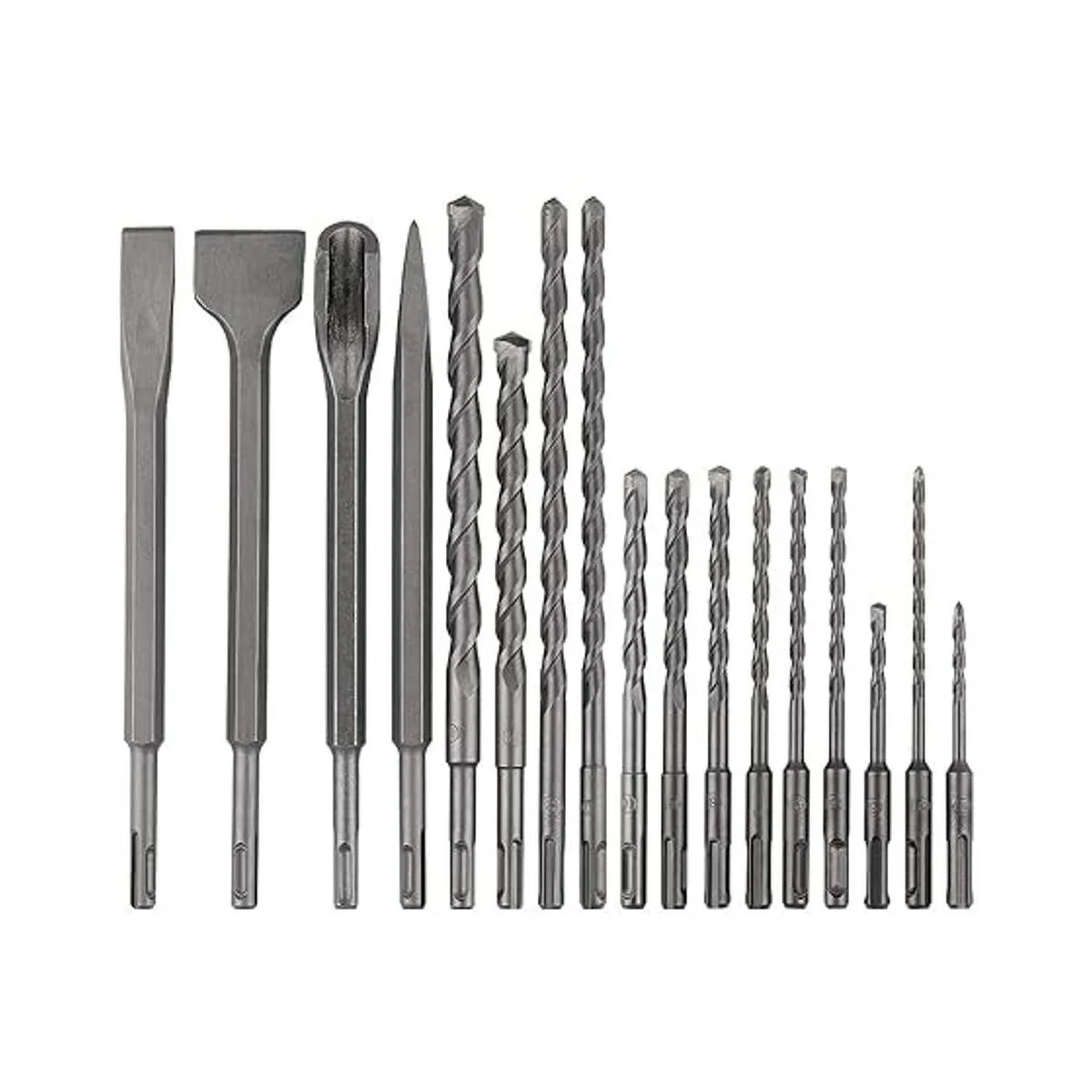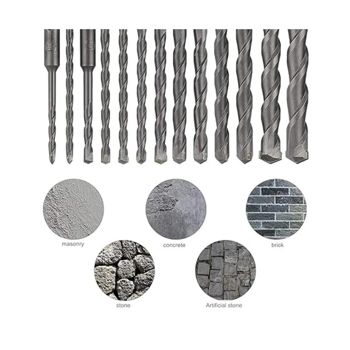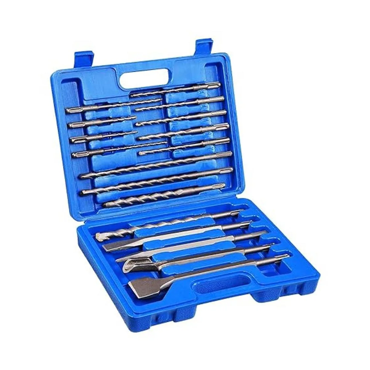 Uso multifuncional: el juego de brocas incluye 13 brocas de 0.217 in, 0.236 in, 0.256 in, 0.276 in, 0.315 in, 0.394 in, 0.472 in, 0.551 in, 0.630 in aprox. 3/16, 1/4, 5/16, 3/8, 1/2, 9/16, 5/8, cincel de 1 punta, 2 cinceles planos y 1 cincel de ranura en U.