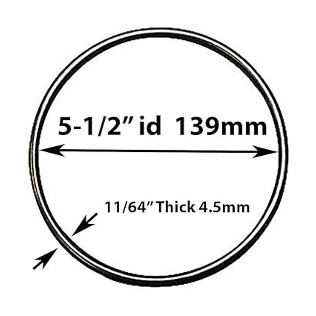 Tamaño: 5.472 in interior x 5.827 in exterior y 0.177 in de grosor. Es de 51/2 pulgadas interior x 513/16 pulgadas exterior y poco menos de 3/16 pulgadas de grosor.