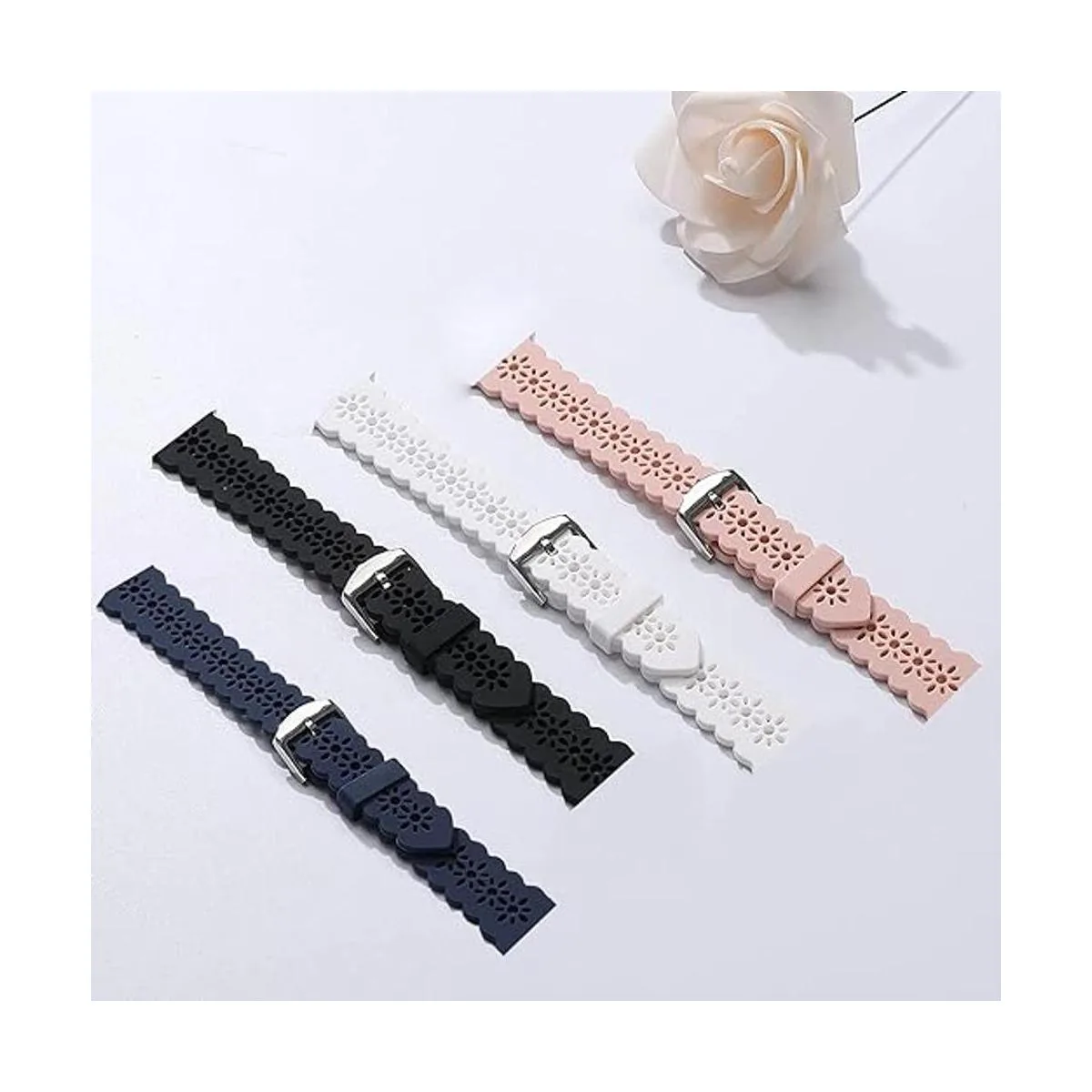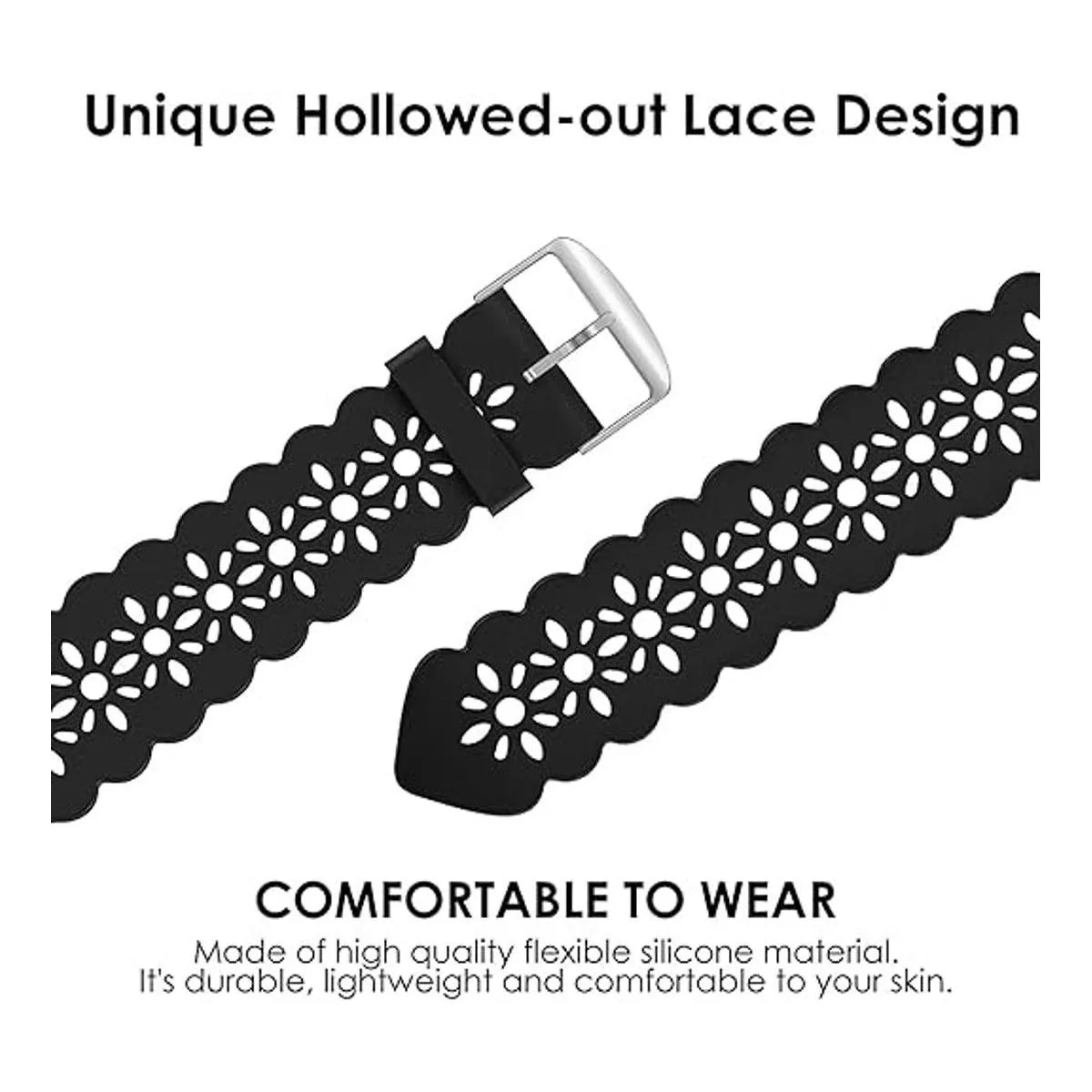 Material de silicona: las correas de reloj de encaje delgado están hechas de silicona de encaje suave de alta calidad y hebilla clásica de acero inoxidable, que puede evitar la irritación de la piel y tiene una textura transpirable y cómoda. La correa para Apple Watch es duradera, impermeable, a prueba de suciedad, ligera y agradable al tacto.