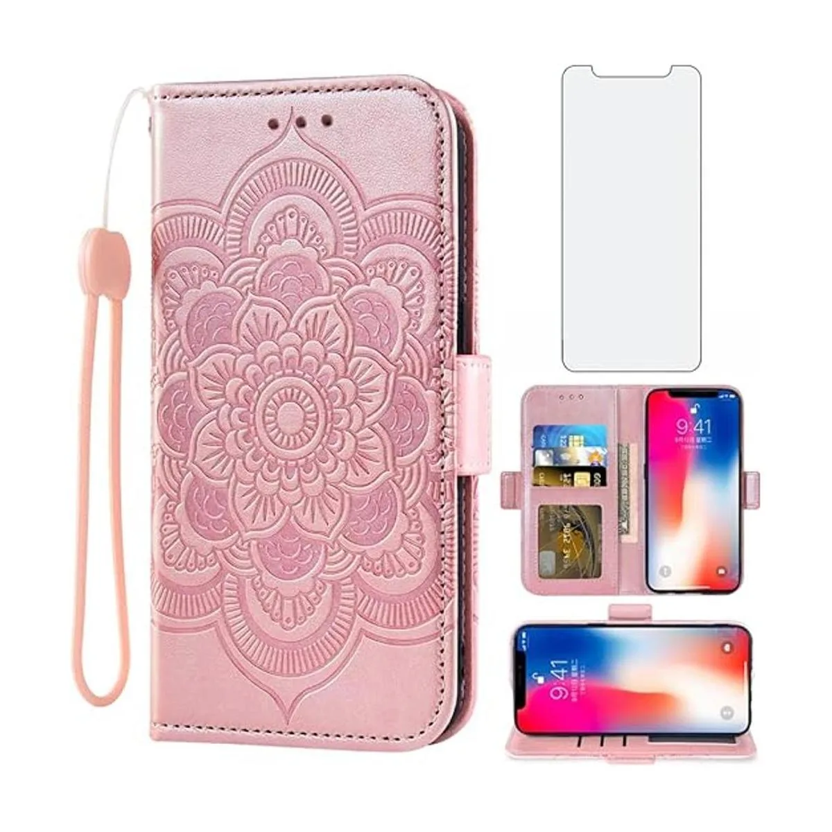 Compatible con iPhone Xs X 10 10s Funda tipo cartera y protector de pantalla de vidrio templado, funda abatible, soporte para tarjetas de crédito, fundas para iPhone X iPhoneXs iPhone10 i PhoneX SX 10x 10xs X, para mujer, oro rosa