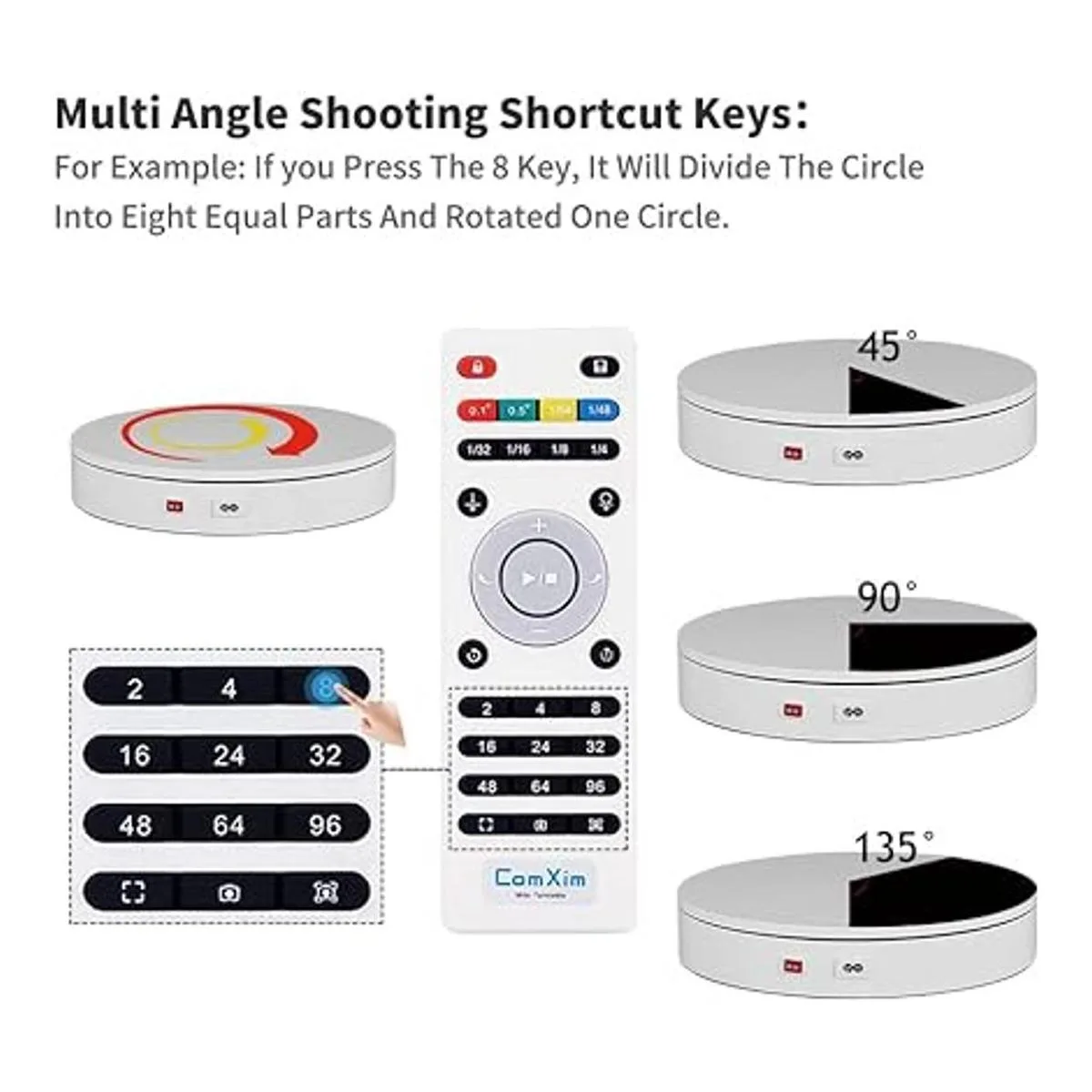 ComXim Mesa giratoria profesional de 360 grados para fotografía de producto, capacidad de 88 libras, diámetro de 12.6 pulgadas, ángulo de control remoto automático, velocidad 24 68 s, dirección, varios modos de rotación