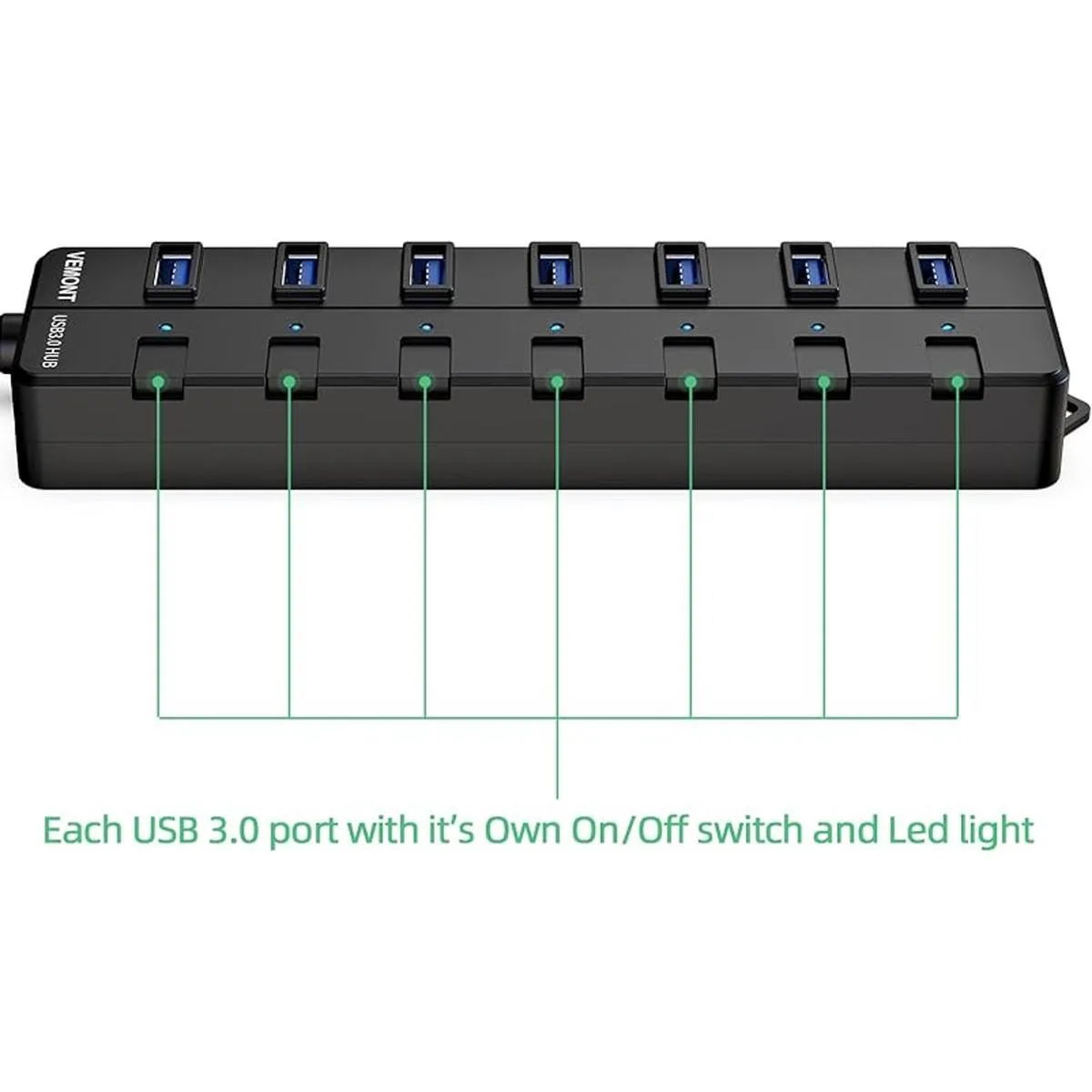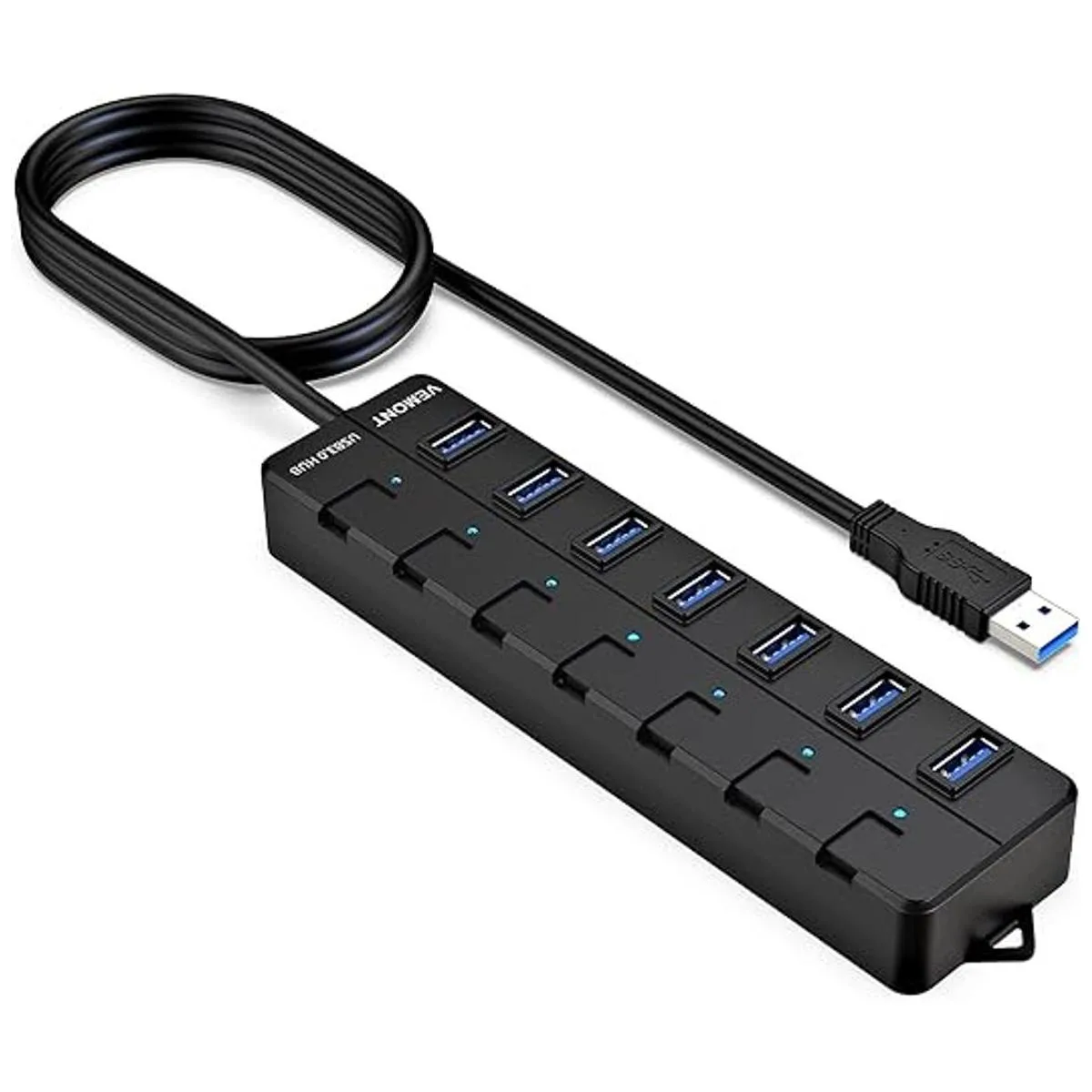 Concentrador USB, concentrador USB de 7 puertos, divisor USB VEMONT 3.0 con interruptores individuales de encendidoapagado y luces, cable de extensión USB de 4 pies de largo para laptop y computadora de PC