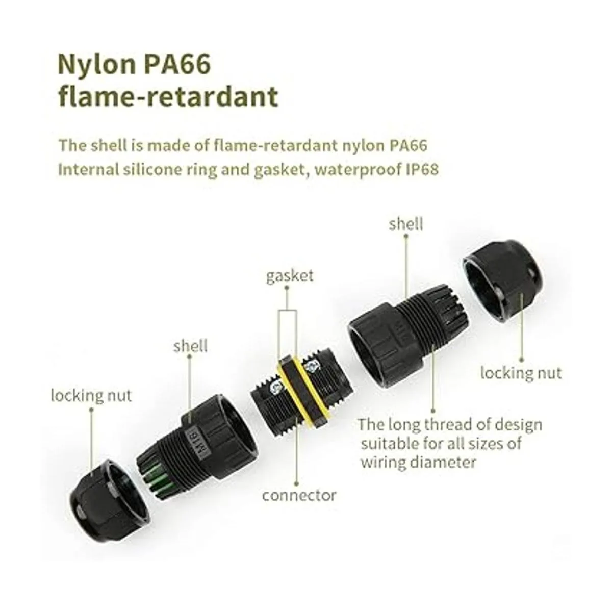 Excelente material: el conector está hecho de material PA66, resistencia a altas temperaturas y bajas temperaturas, ignífugo V0, temperatura de trabajo: 40.0 F 221.0 F, certificado UL TUV SAA CE ROSH.