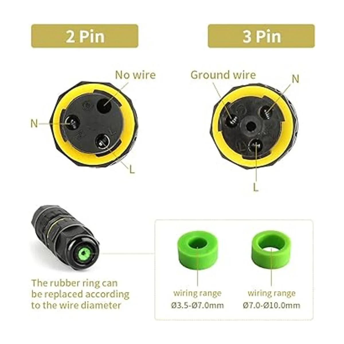 Conector de caja de conexión: conector de enchufe M16 de 2 vías 2 polos, con dos tamaños de anillo de goma, rango de cable: 3,0.1970.276 in/0.2760.394 in, los conectores incluyen cable vivo y cable neutro.