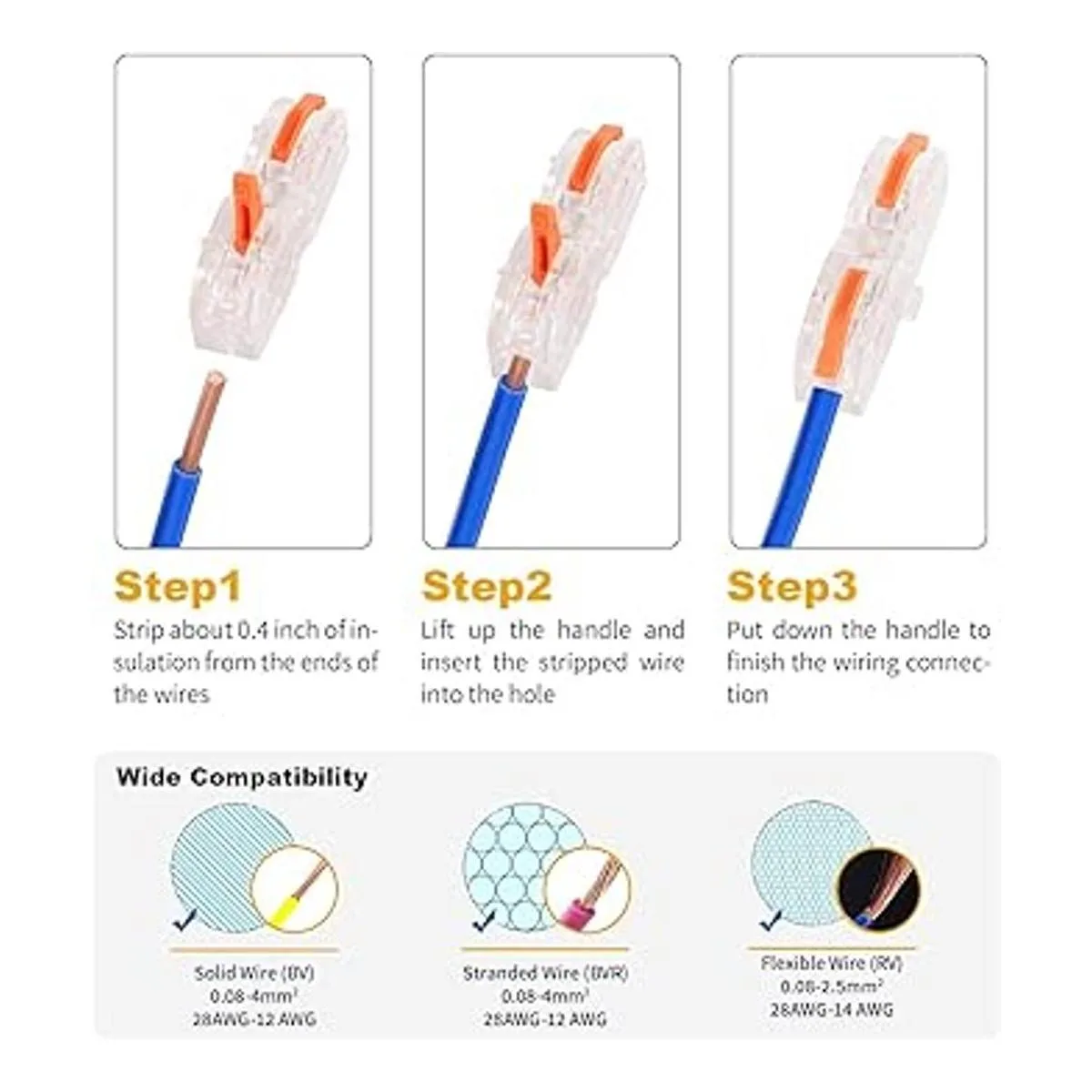 Seguro y fiable: los conectores de cable de palanca están hechos de material aislante, que cuenta con retardante de llama, resistente a la corrosión, resistente al alto voltaje y larga vida útil.