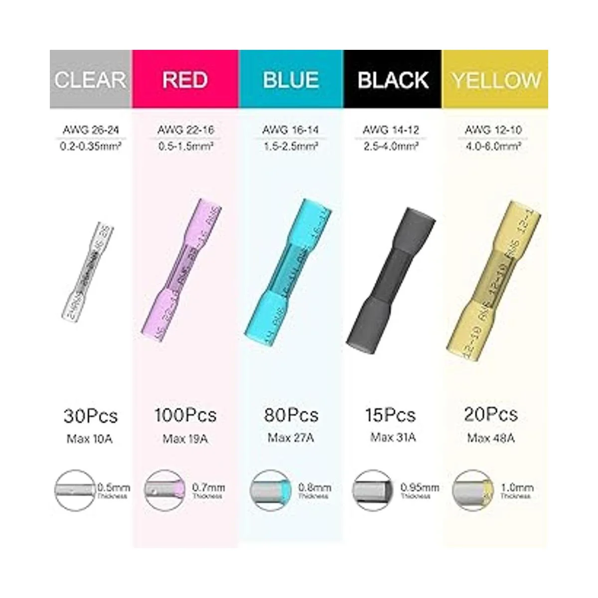 Kit de conector de trasero cuidadoso: el paquete considerado incluye 5 tamaños diferentes de conectores de tope que contienen 30 piezas de cristal 2624 AWG, 100 piezas rojas 2216 AWG, 80 piezas azules 1614 AWG, 15 piezas negras 1412 AWG, 20 piezas amarillas. BAJO 1210 AWG en un estuche organizado, para satisfacer tus diferentes necesidades de medidores de alambre para proyectos eléctricos. El color y los medidores de alambre impresos en la superficie te ayudan a seleccionar los conectores necesarios en cuestión de segundos