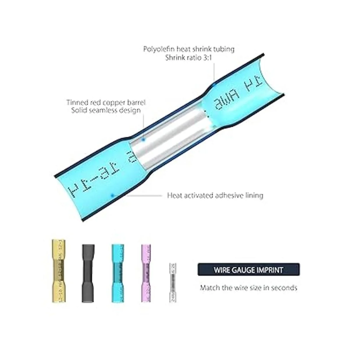 Hecho para durar: gracias al grueso cobre estañado y al diseño de barril sin costuras, garantiza un crimpado fuerte y seguro todo el tiempo sin problemas de salida. Además, el tubo termorretráctil de poliolefina proporciona la alta resistencia a la tracción y resistencia a los daños mecánicos, por lo que no hay preocupación de masticar ratas o problemas de daños físicos similares. Cuando se calienta con una de calor, el adhesivo que se derrite en el interior crea un sello impermeable y aislado, evitando fugas eléctricas y corrosión