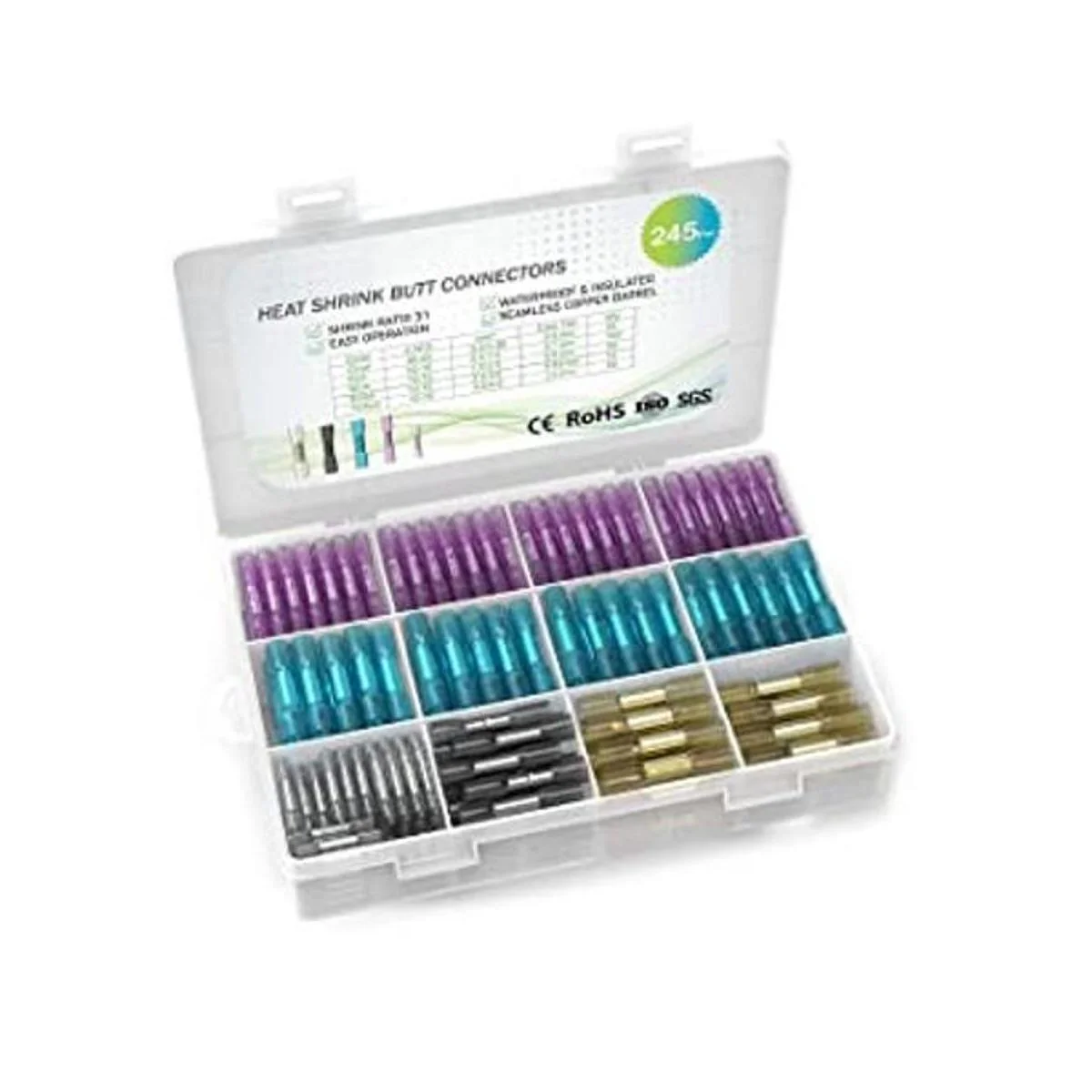 Conectores de extremo termorretráctiles, 245 piezas aisladas, impermeables, kit de conectores de cable eléctrico, terminales de crimpado de alambre de grado marino, surtido de empalmes de tope, ideal para barcos, camiones, estéreo 2610 AWG
