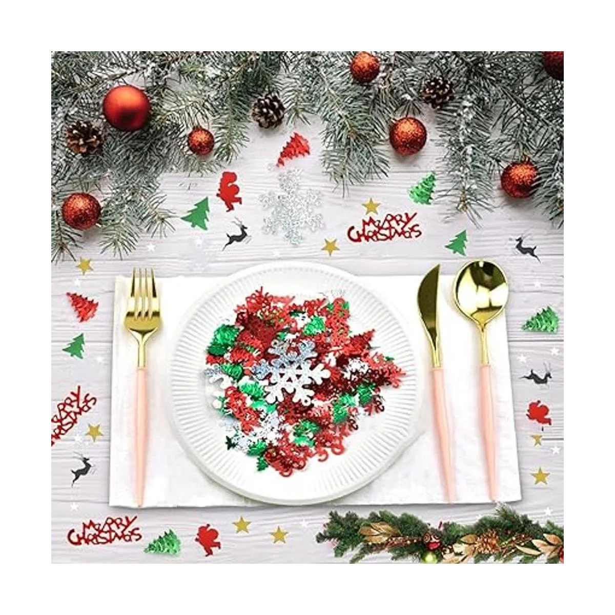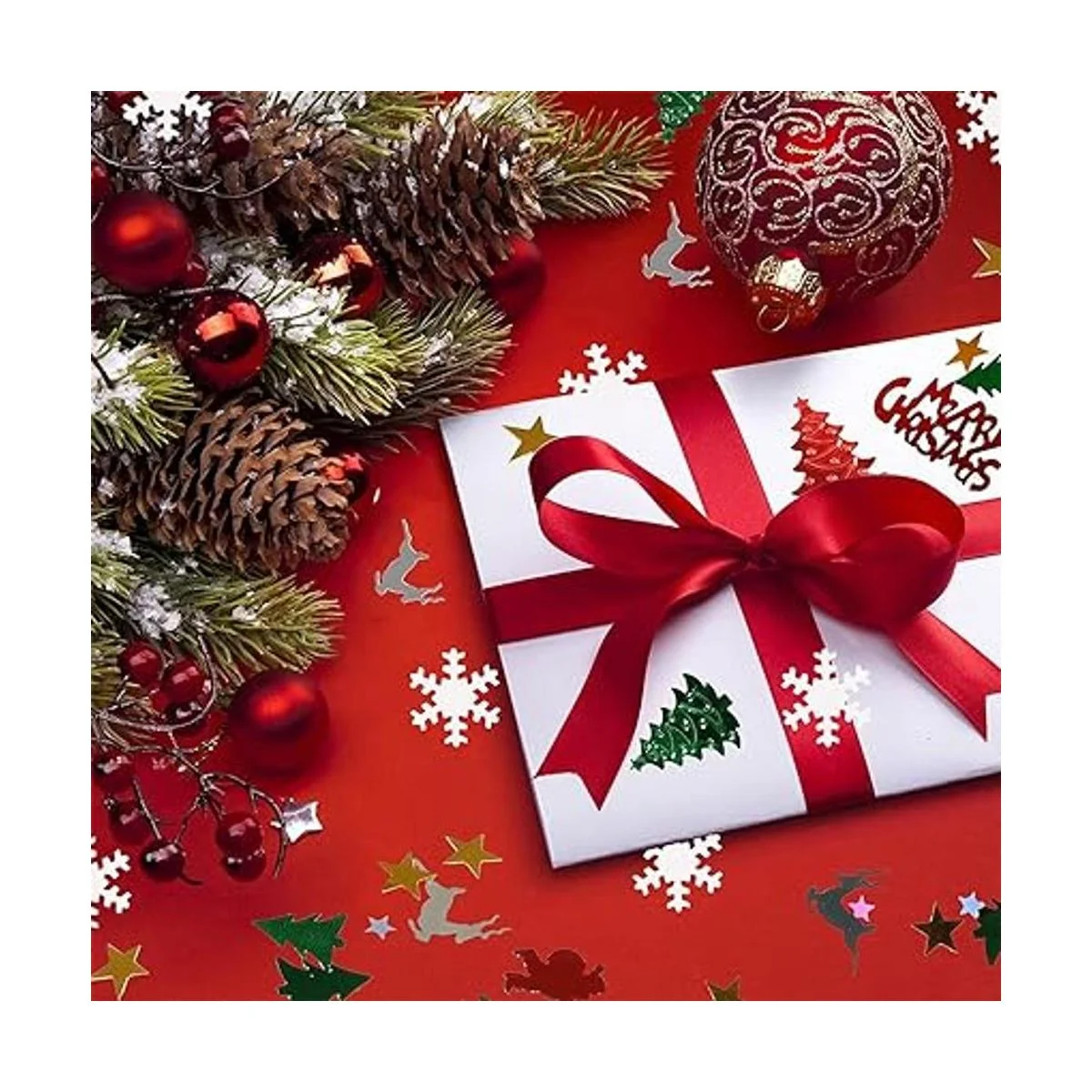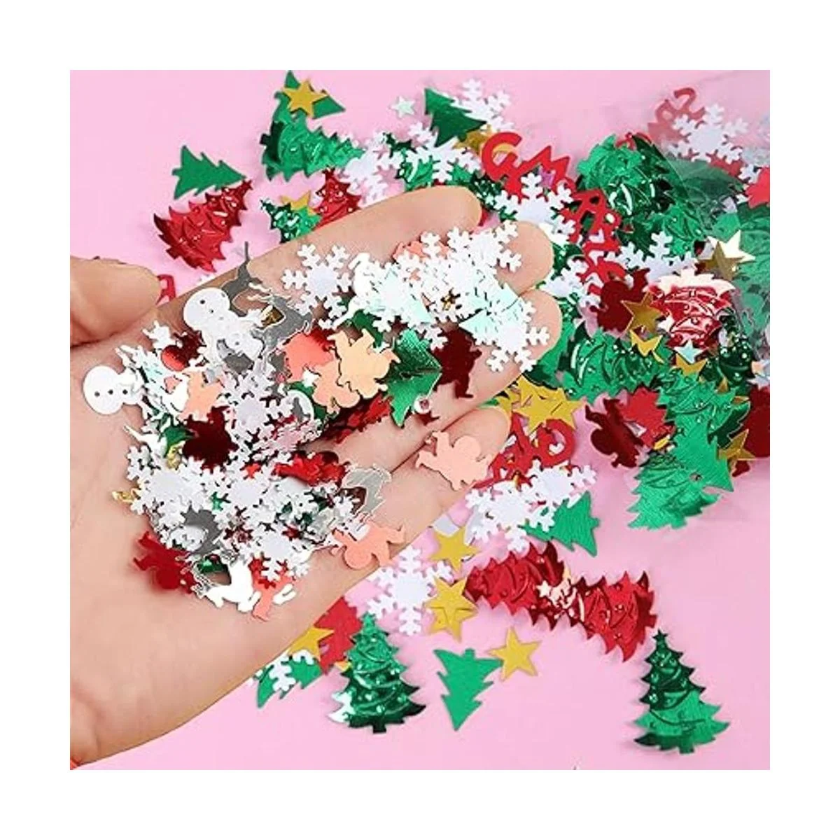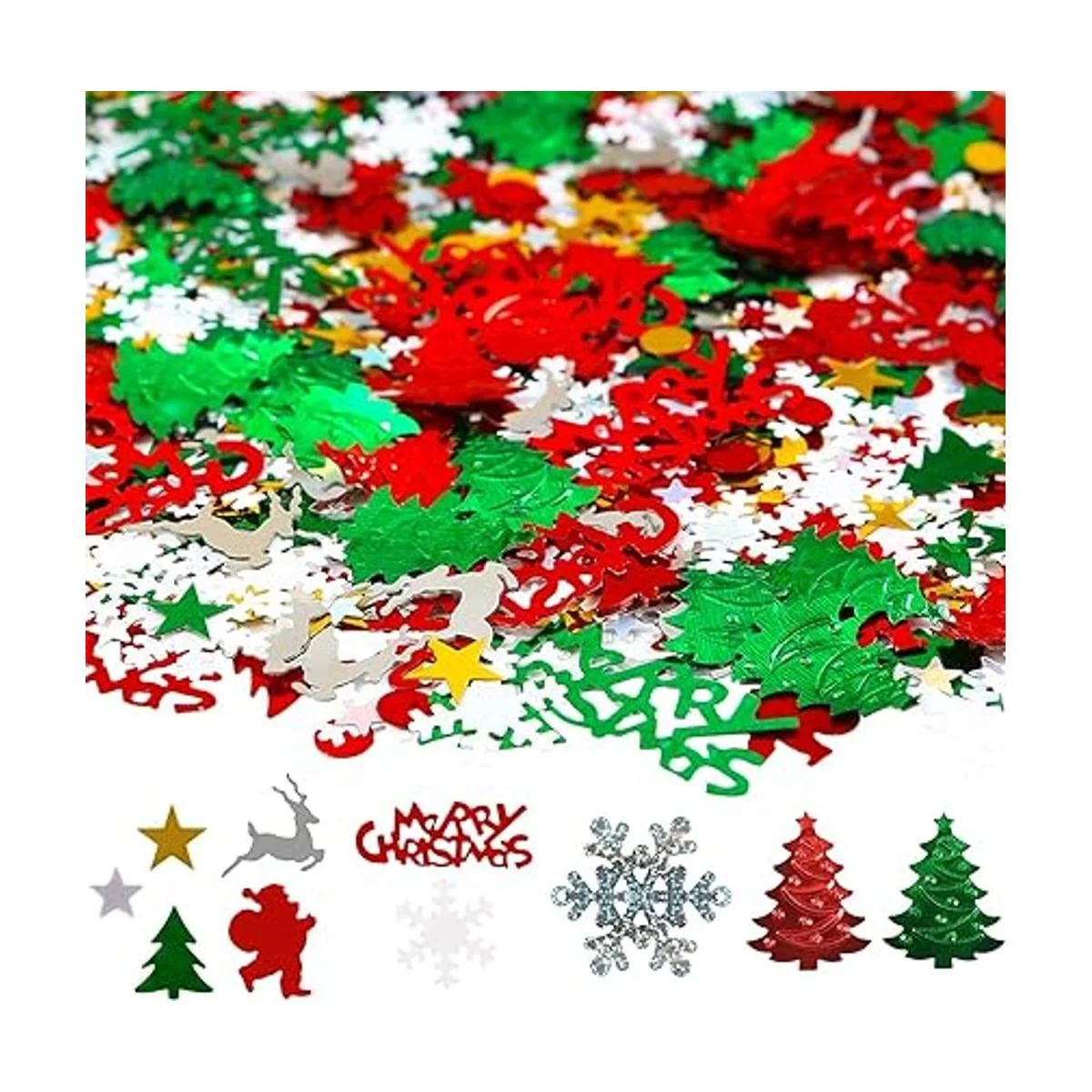 Paquete: recibirás 1 paquete: mezcla de confeti de Navidad surtida de 3.53 oz, alrededor de 4800 piezas de confeti de Navidad.