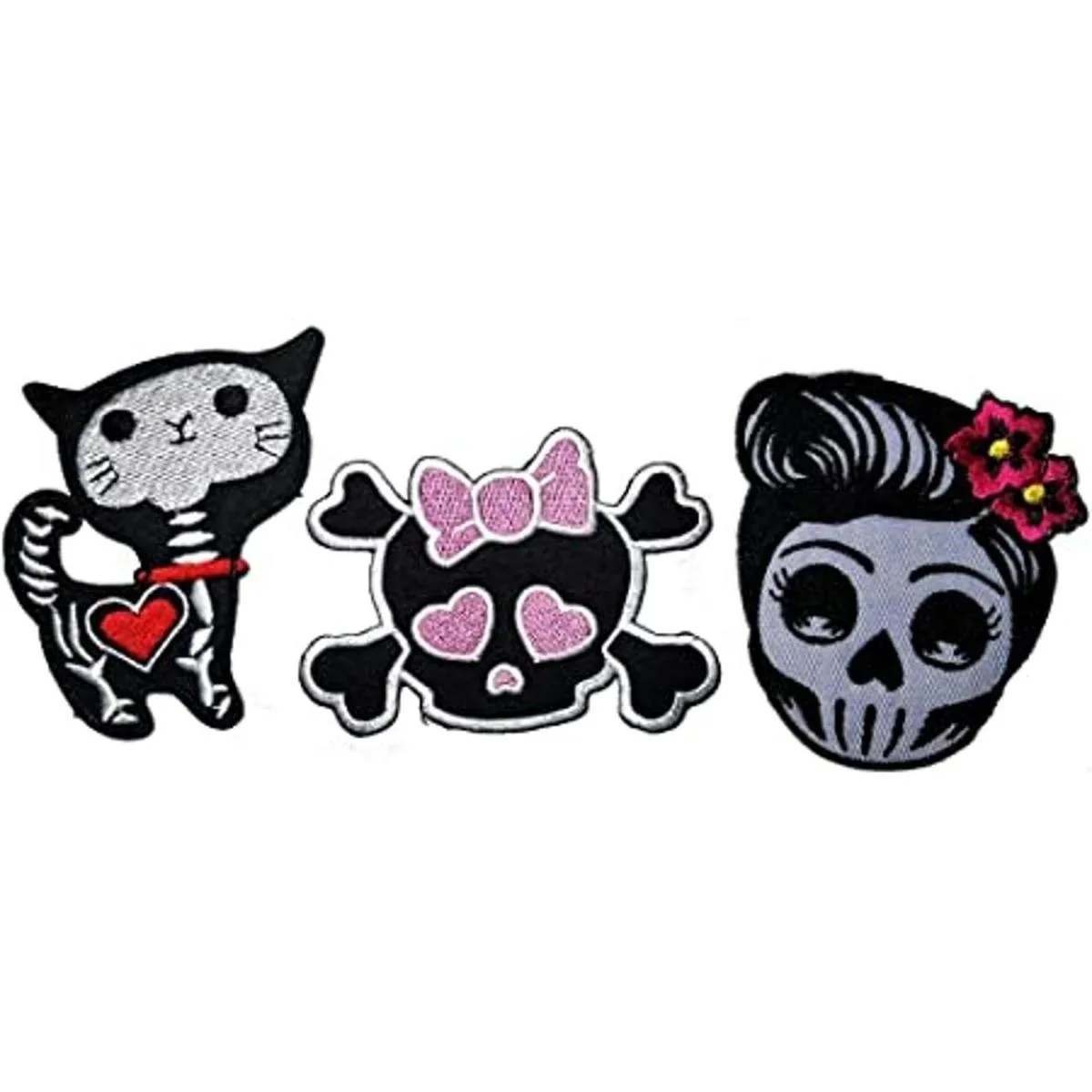 Conjunto de parches de PP lindo cráneo Crossbones chica con arco rosa Punk Rock Shock esqueleto flor azúcar cráneo de rayos X gato divertido dibujos animados DIY apliques bordado coser en parche