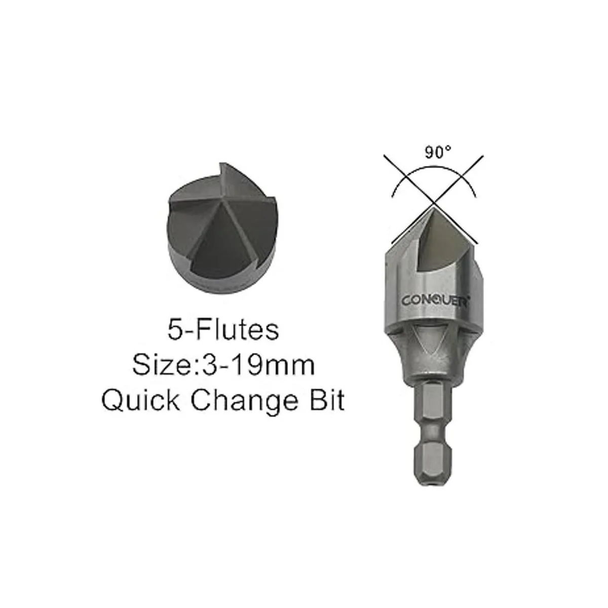 CONQUER Herramientas Broca avellanadora de metal de 5 flautas, 90 grados para vástago hexagonal de 14 pulgadas, ajuste de vástago de 1834 0.118 in0.748 in, eliminación de rebabas, herramienta de biselado de desbarbado, corte de molduras, escariador interiortubo