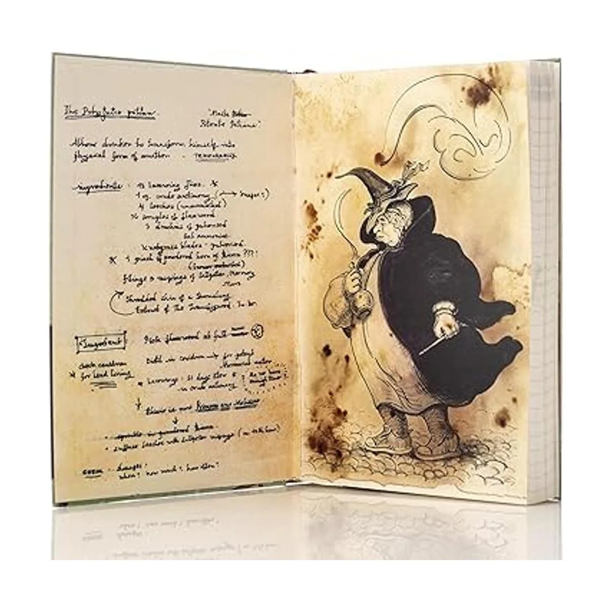 . Wands At The Ready Nuestro nuevo diario forrado de Harry Potter Spells and Charms cuenta con la receta de poción de polijugo y el arte de la pared del caldero filtrado en las páginas finales. Los calderos, Felix Felicis y otros objetos mágicos se presentan en cada página.