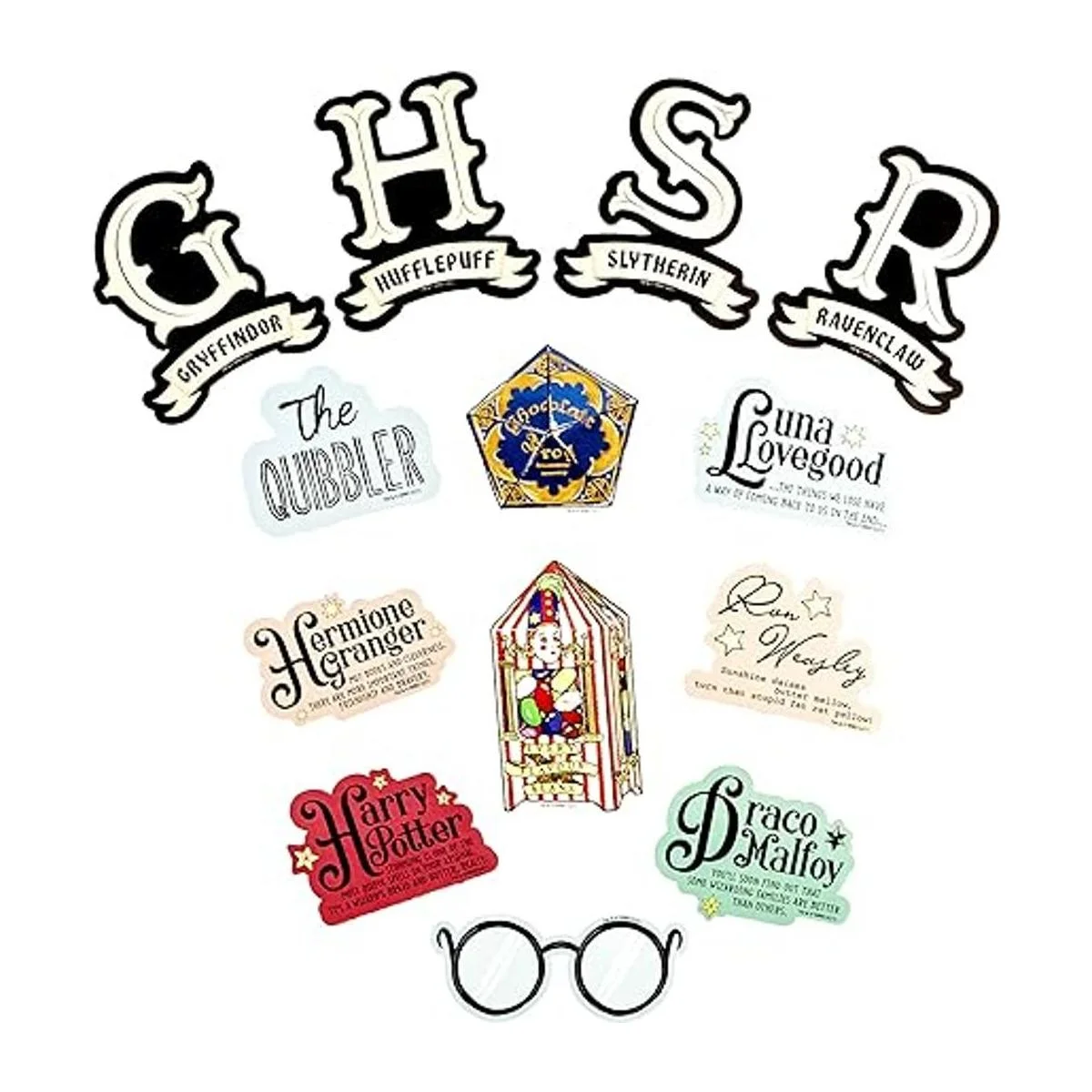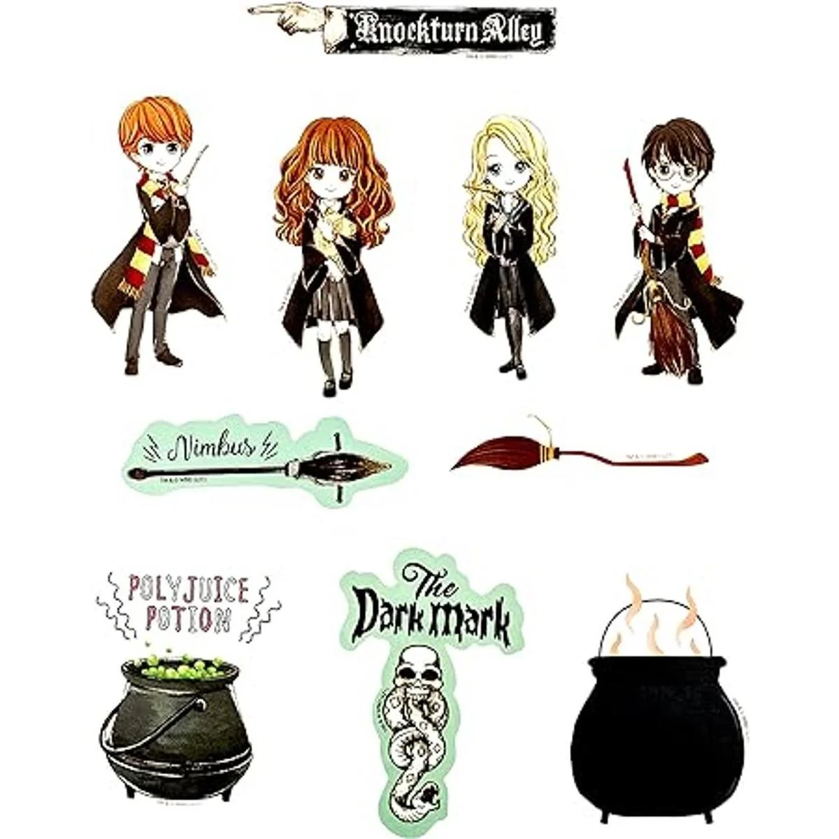 Varitas listas: con tus personajes, iconos, citas y artículos mágicos favoritos en un nuevo estilo de arte súper lindo. Harry, Ron, Hermione, Luna se presentan junto con citas favoritas e incluso zapatos robados de Luna