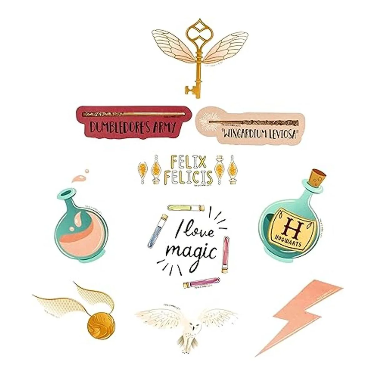 Mantén viva la magia Si eres como nosotros, nunca puedes obtener suficiente, haz que tus imágenes y refranes favoritos de Harry Potter sean parte de cada día con nuestro paquete de calcomanías Wands At The Ready. Todas las imágenes utilizadas en la creación de este paquete de calcomanías son auténticas de The Wizarding World of Harry Potter.