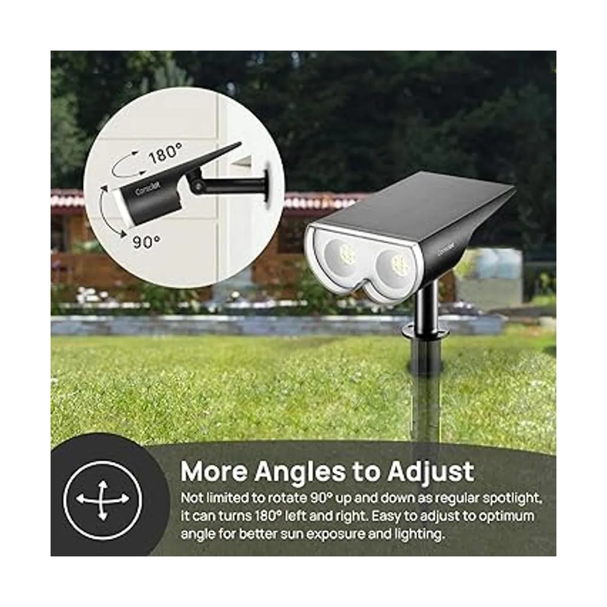 Más ángulos para ajustar: en comparación con la luz de paisaje regular, el foco solar Consciot no solo es capaz de ajustarse 90 grados hacia arriba y hacia abajo, sino que gira 180 grados a la izquierda y a la derecha. Una ventaja deseable cuando se instala en la pared. Súper flexible para girar la luz a donde la necesites.