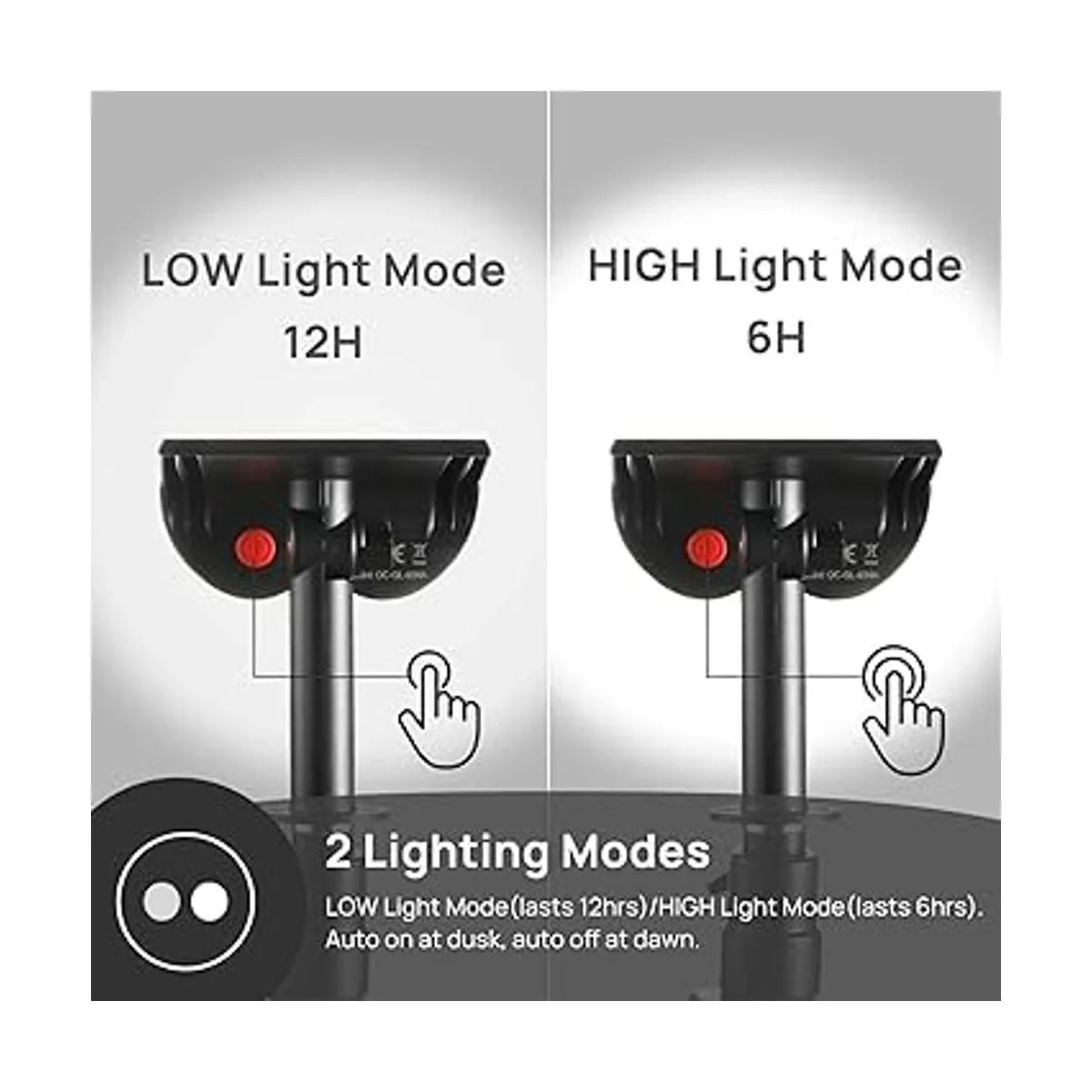 2 modos de iluminación: modo de luz baja dura 12 horas/modo de luz alta dura 6 horas para ser seleccionado por la noche. El foco solar puede detectar el nivel de luz de la luz natural, se encenderá automáticamente al anochecer o cuando se oscurece, se apaga y cambia al modo de carga durante el día.