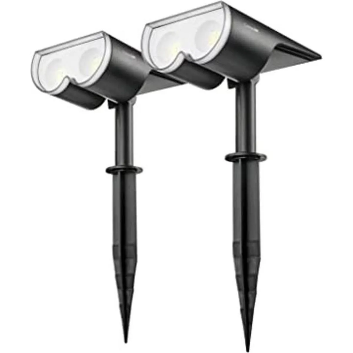 Instalación mejorada 2 en 1 Solución 1: pegar en el suelo con estacas especialmente diseñadas. La hoja de la estaca está dentada para una fijación segura al suelo. Solución 2: montado en la pared con tornillos incluidos. Ideal para colocarlo junto al jardín, camino, patio, piscina, patio, porche, etc.
