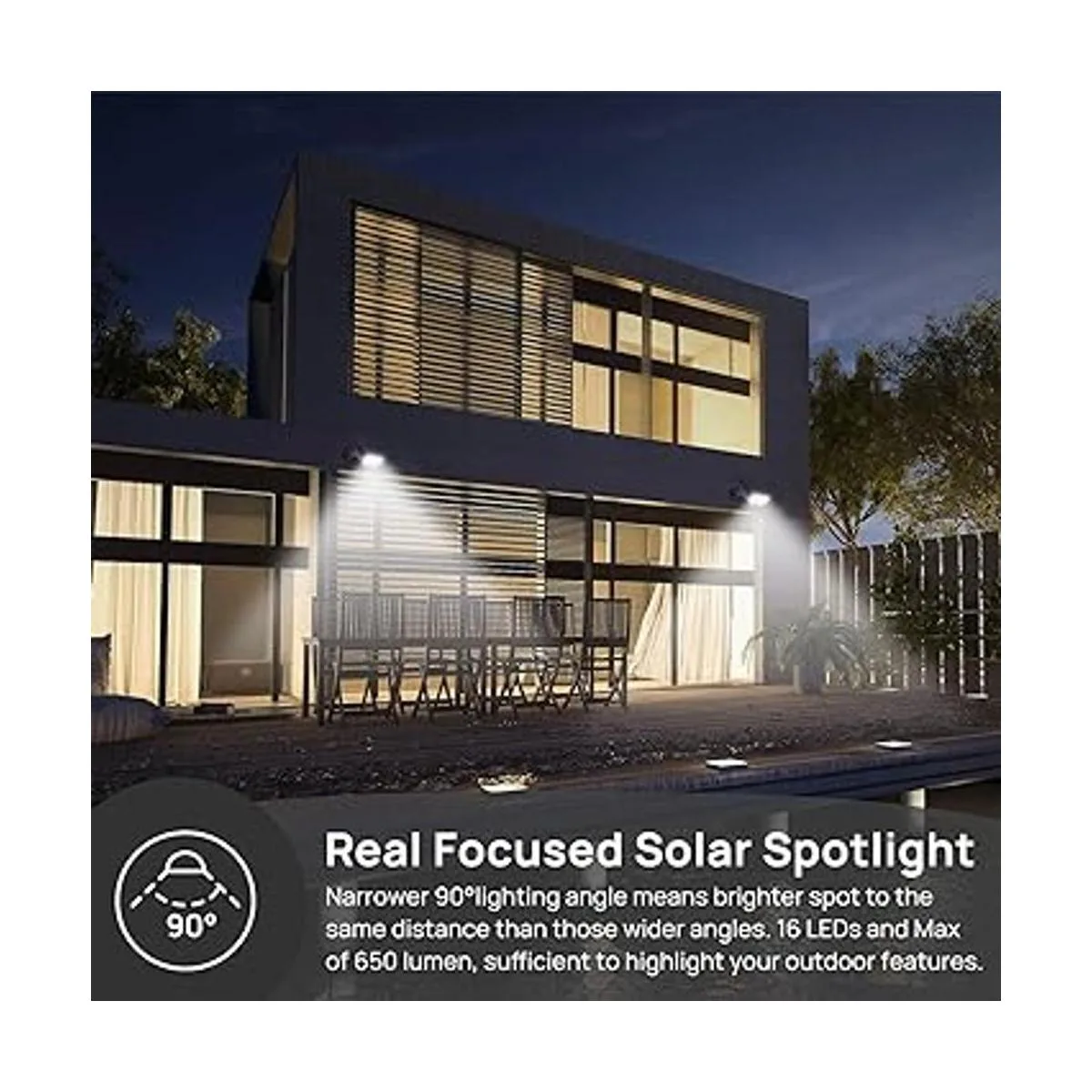 Foco solar enfocado real: 16 LED blancos fríos con un ángulo de iluminación de 90 más estrecho y máximo de 650 lúmenes, brilla más brillante y haz enfocado a una distancia más larga que esos ángulos más amplios, resalta mejor las características arquitectónicas en el exterior. Cargador más rápido con panel solar más grande.