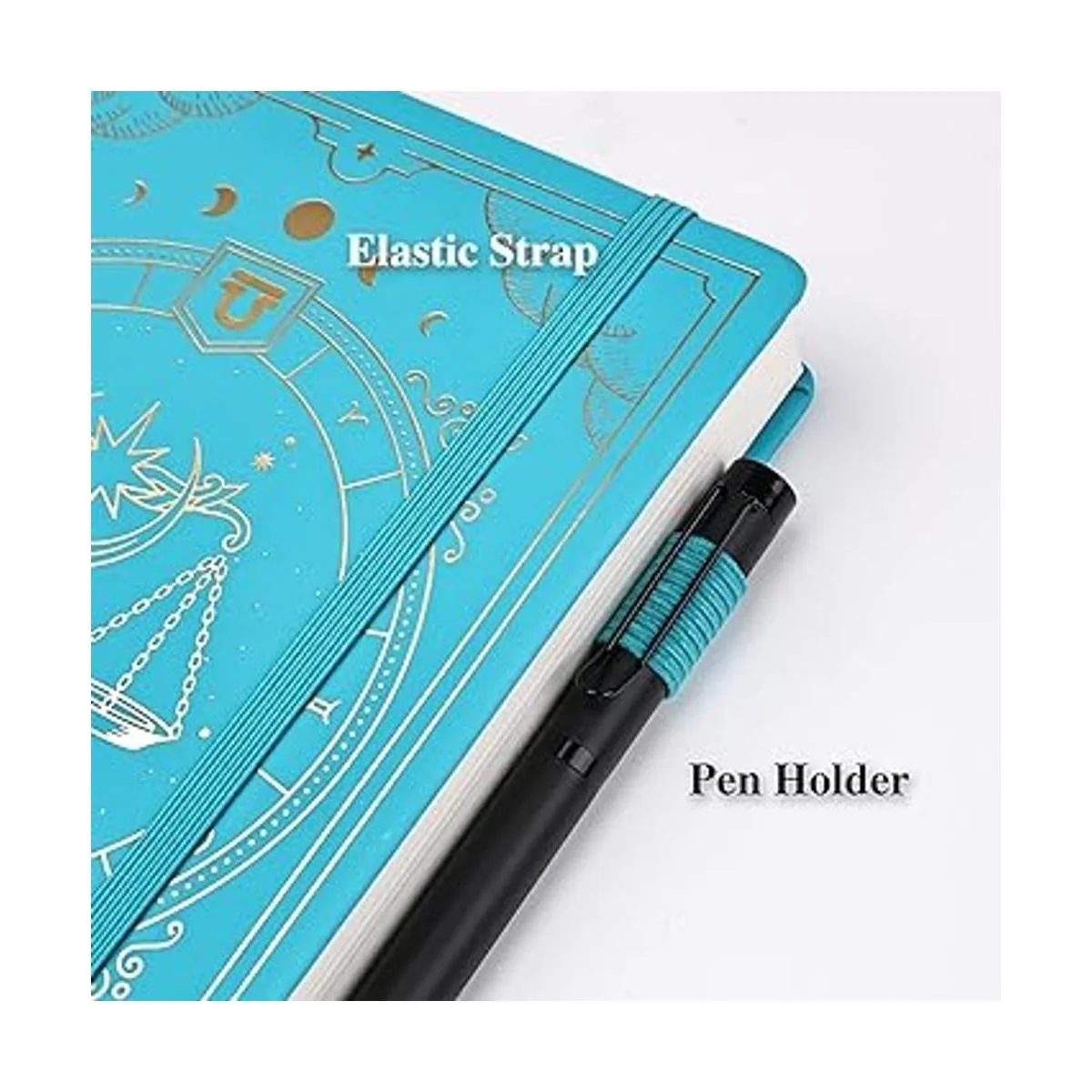 Diario de tapa dura de cuero: la clásica funda de cuero cuenta con duradera y resistente al agua. Su superficie está grabada con patrones de constelación dorada, por lo que es cómoda y suave al tacto. El diseño de esquina redondeada hace que el cuaderno no sea fácil de dañar, una correa elástica duradera para un cierre rápido, un soporte para bolígrafo para hacer que tu bolígrafo ya no sea solo.
