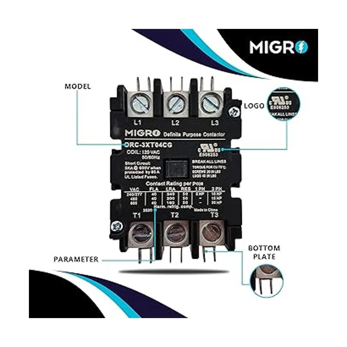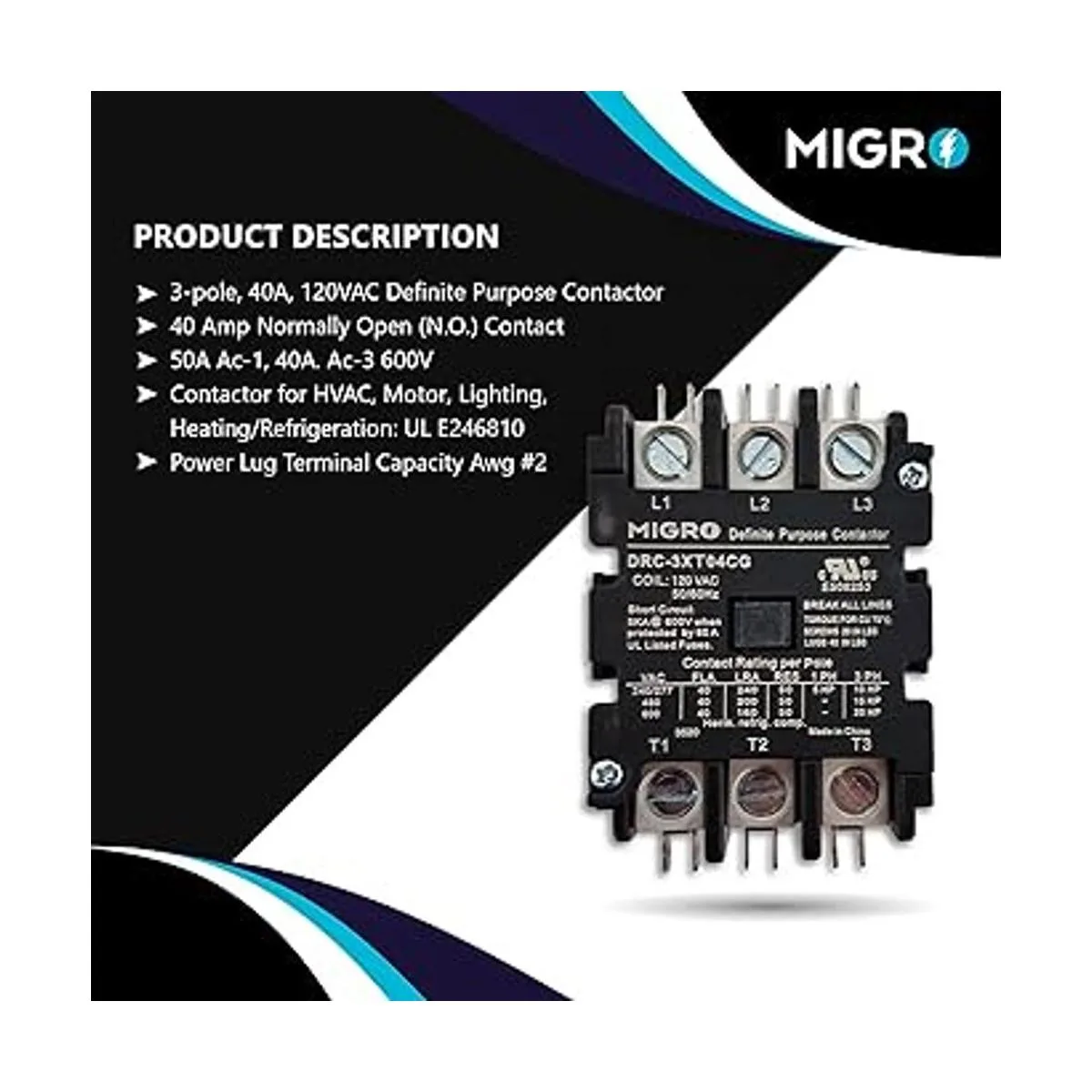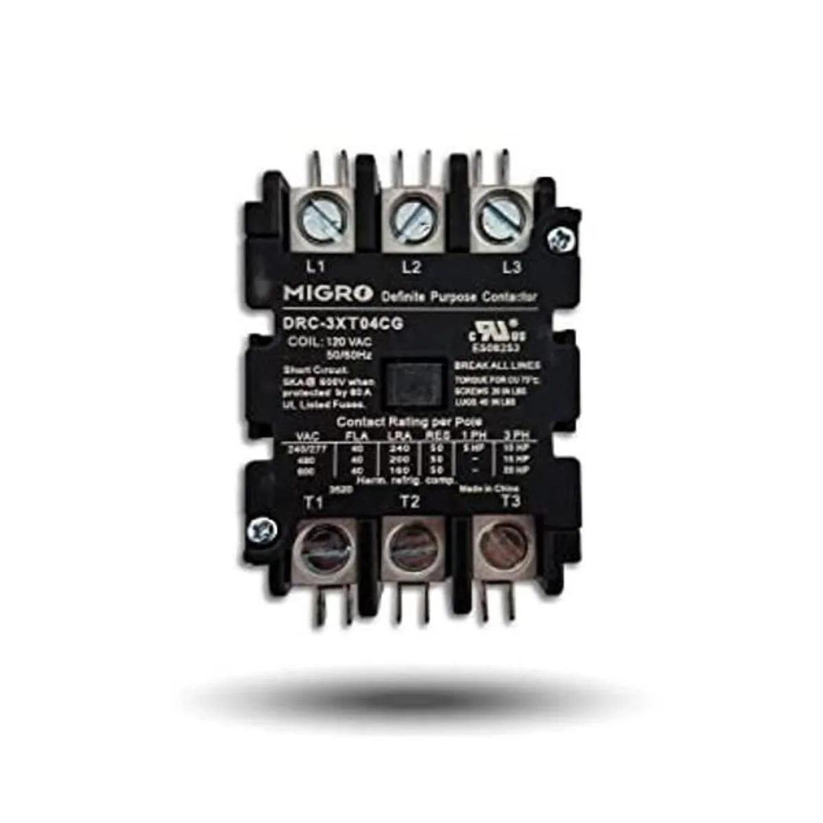 Clasificación de 40 amperios FLA 3 polos Contactor de propósito definitivo de bobina de 110/120 voltios. Sustituye a la mayoría de contactores de 3 polos clasificados a 20 amperios, 25 amperios, 30 amperios, 35 amperios o 40 amperios en aire acondicionado y bombas de calor