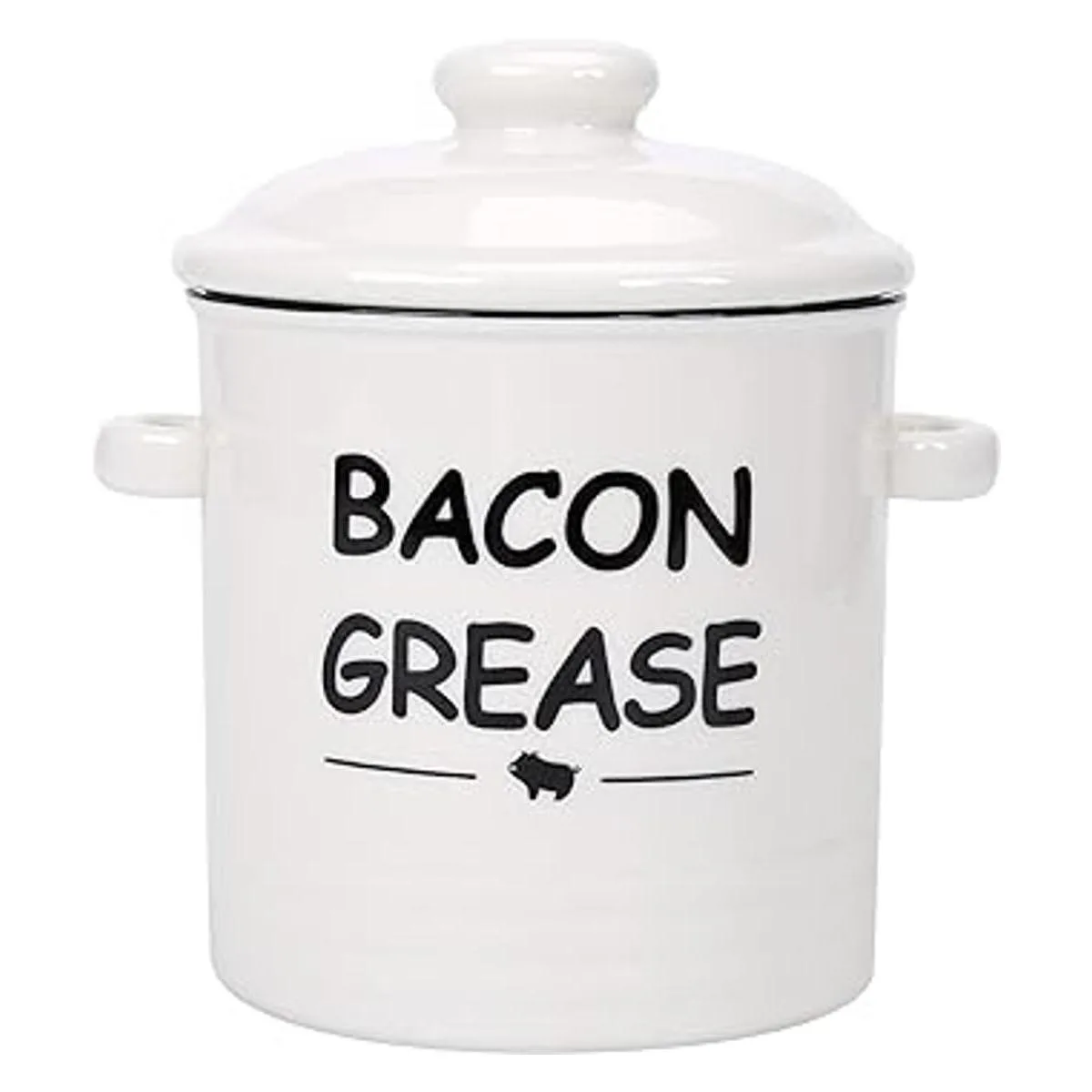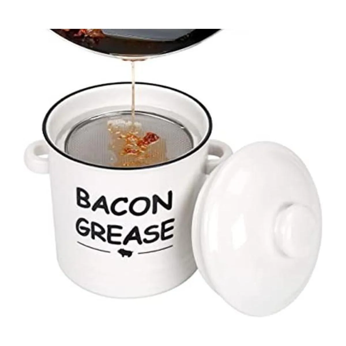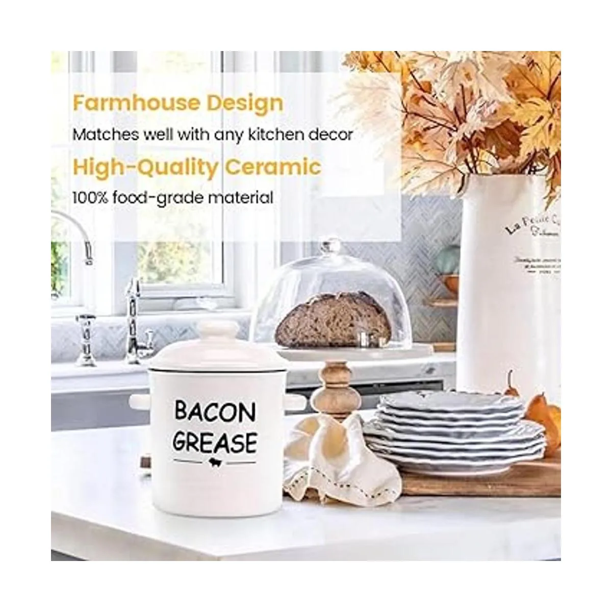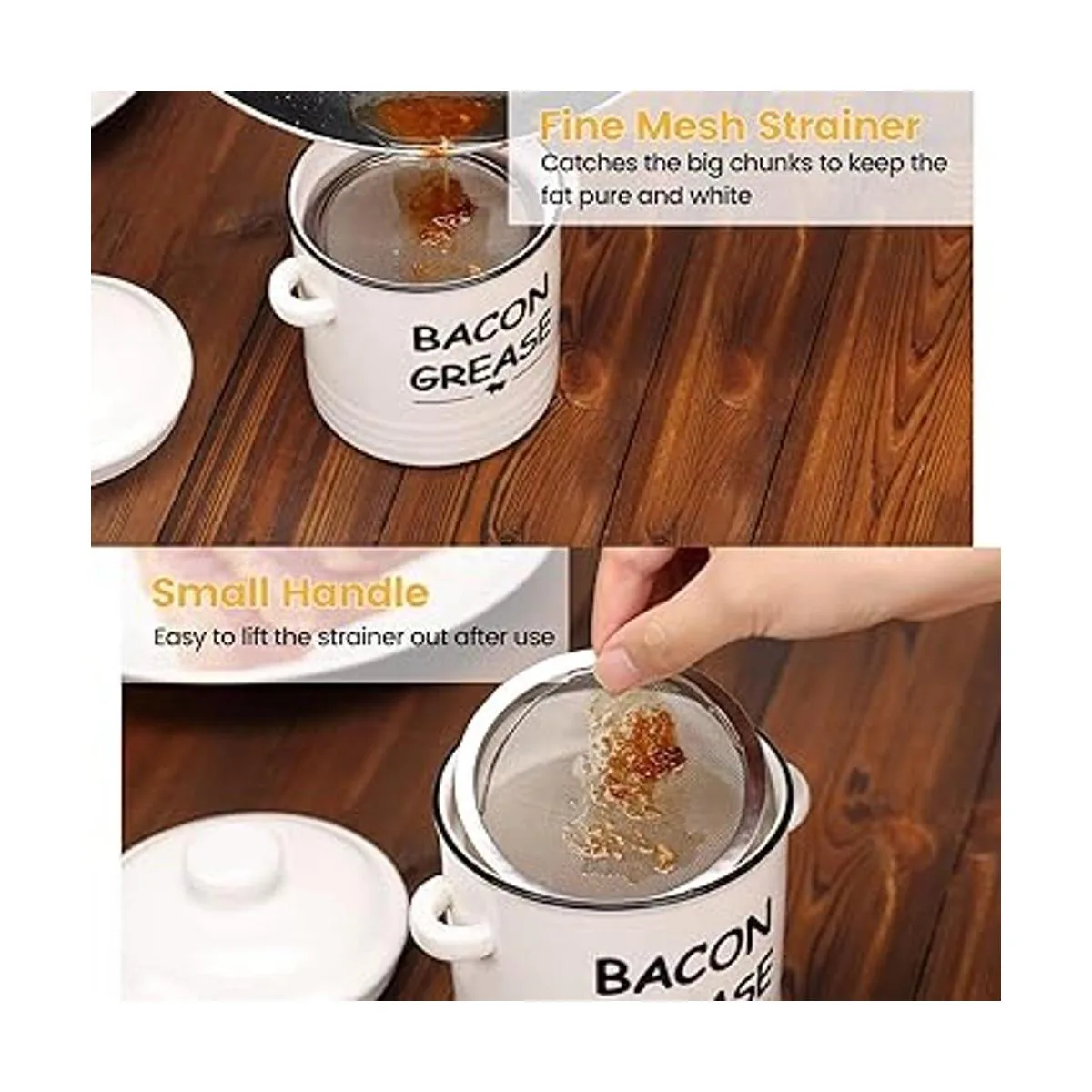 Contenedor de grasa de tocino de cerámica con colador, 20.3 fl oz 20 oz con mango de fácil agarre, lata de grasa de tocino para goteo de grasa y almacenamiento, color blanco cremoso
