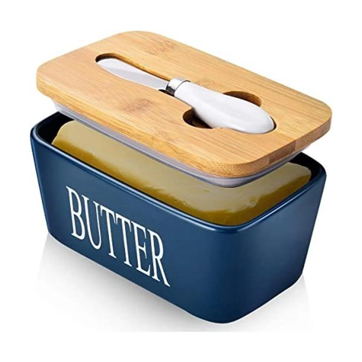 Contenedor de mantequilla de cerámica grande con cuchillo, sostiene hasta 2 utensilios, con tapa de bambú y acero inoxidable de doble capa de silicona, buen regalo de cocina