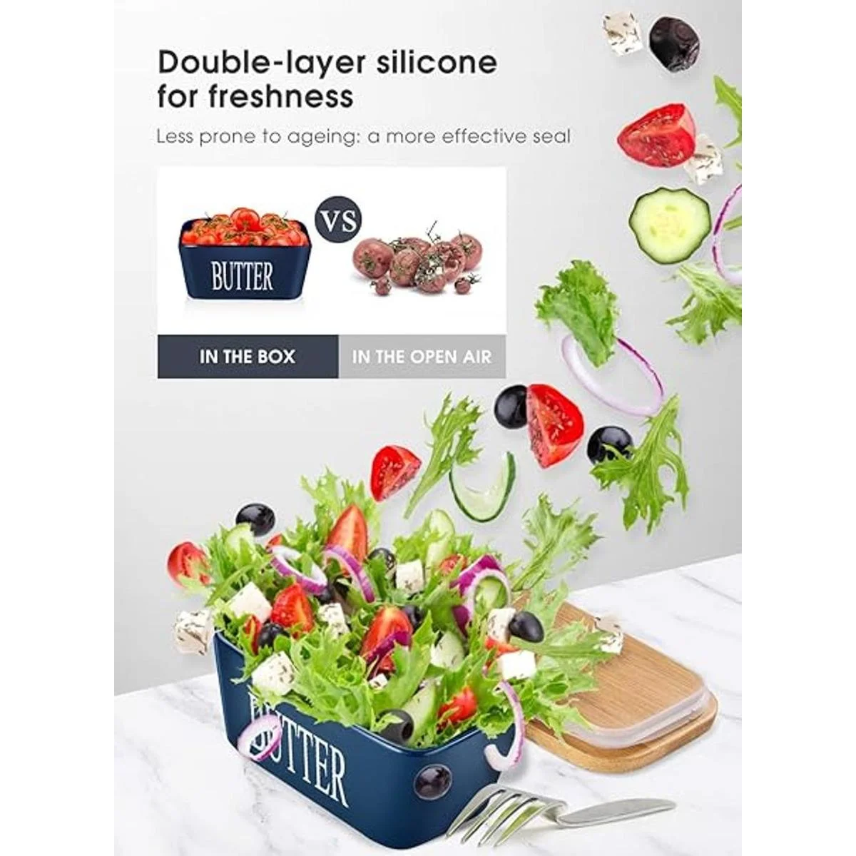 Frescura: la tapa de madera de bambú tiene un anillo de silicona sellado que ayuda a mantener la mantequilla fresca durante más tiempo, sin absorber el sabor de otros alimentos en el refrigerador.
