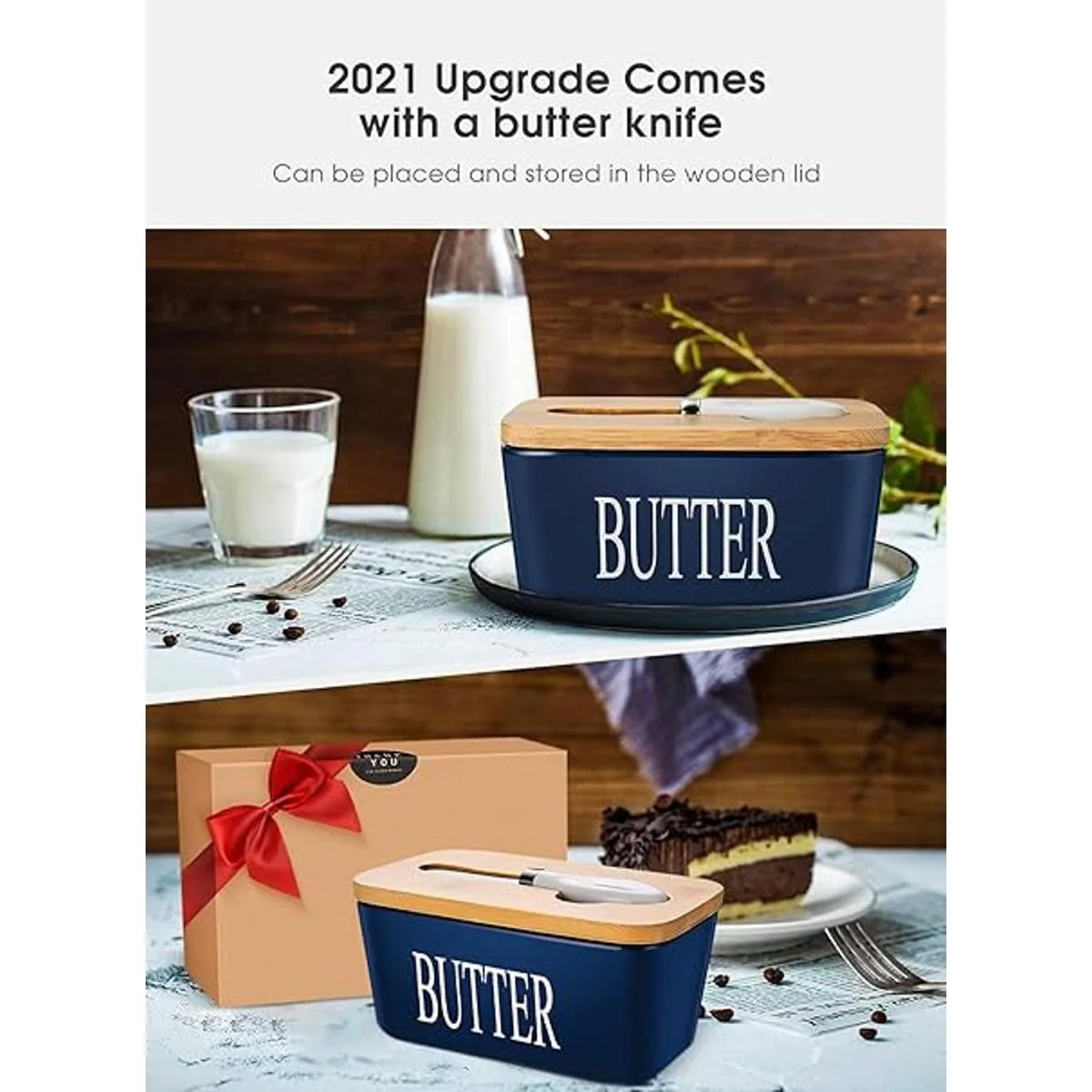 Versión actualizada: la tapa tiene una ranura que se adapta perfectamente al cuchillo, integrando el cuchillo de mantequilla y el contenedor. No te preocupes por no tener un cuchillo de mantequilla cuando quieras cortar un poco de mantequilla. La tapa de bambú mejorada es más duradera que las tapas anteriores, a diferencia de los materiales sintéticos, el bambú envejecerá con elegancia. También aporta un estilo natural a tu cocina.